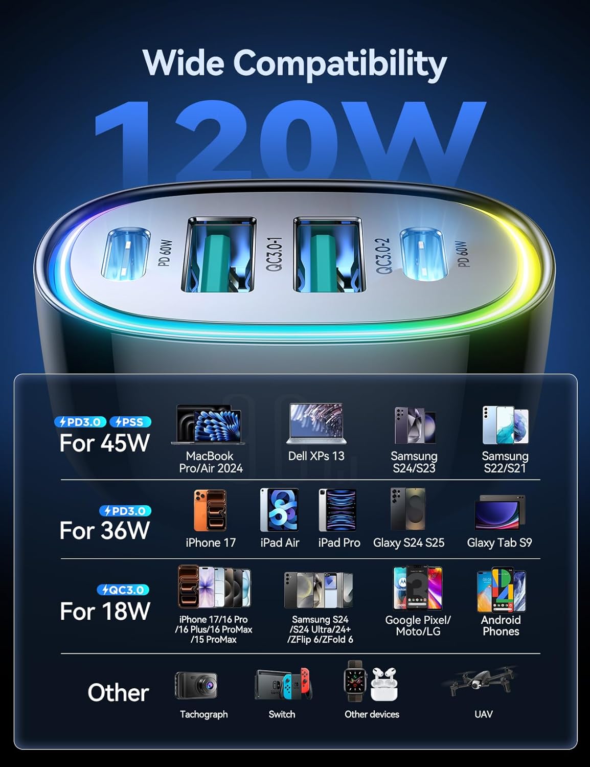 | BuiltIn Media | ►120W 4-Port Car Charger [2025 Upgrade] ►3.3FT-60W USB-C Nylon Cable ►36-month to solve any problems ; ► User Manual |