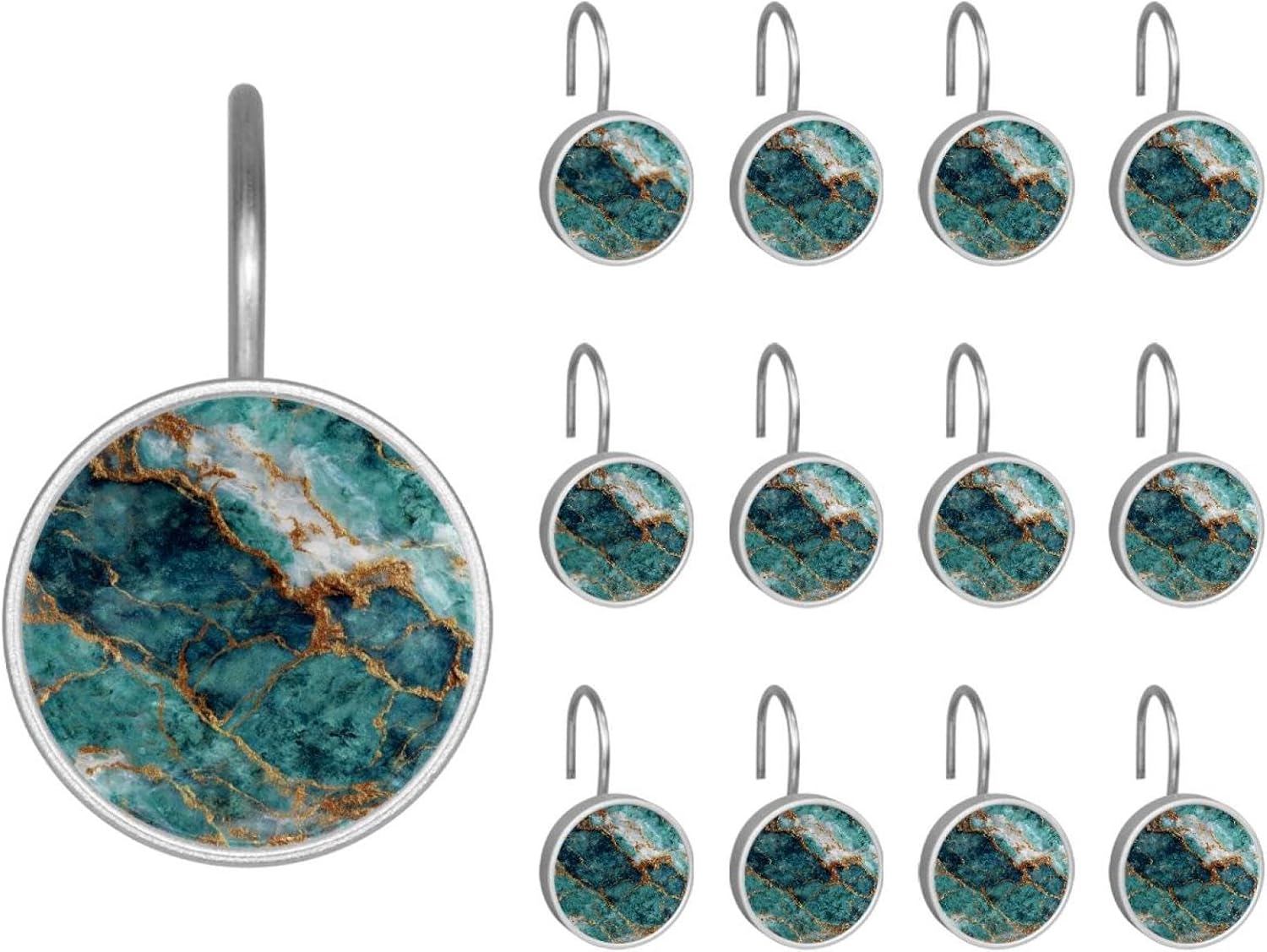 MATERIAL: glass, stainless steel. These shower curtain hooks can be decoration bathroom and will be long-lasting.12 pieces of shower curtain hooks, round crystal glass decoration, printed patterns, silver hooks to match various styles of bathroom shower curtains. SIZE: Crystal glass diameter of round shower curtain hook is 1.45x1.45in/ 3.7x3.7cm. The shower curtain hooks diameter is about 1.1in, 12 pieces shower curtain hooks are suitable for rod of 8-28mm(0.3"-1.1"). RUST RESISTANT:Shower hooks are made of stainless steel and crystal glass, which is durable, rust-proof and corrosion-resistant, it will not rust suitable for wet bathroom environment. EASY TO INSTALL:Hand the shower curtain hooks hold securely on straight or curved shower curtain rods,slid easily and smoothly. Easy to install and decorate your bathroom. BEAUTIFUL AND ELEGANT:Beautiful Love hook add charming scenery for your bathroom, baby room, bedroom, living room, and the gorgeous style is easy to match with any kinds of bathroom shower curtain. EASY GLIDE: Open and close your shower curtain quickly and easily with the Shower Hooks, easily glides on shower curtain rods and tension rods. No snagging; no effort; no hassle PACKAGE: 12 shower curtain hooks in a pack.The bathroom curtain hook has a smooth appearance and can be hung on the pole to pull it at will. Special price 12 sets to meet your needs.