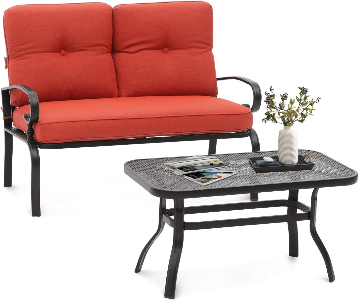 About Patiomore Patiomore is a young company with rich experience in the outdoor furniture market, committed to creating a premium and exquisite outdoor leisure space for every customer, let you and your family embrace nature and enjoy the sunshine life. We feature a variety of wicker resin and wrought iron furniture. Different from the bulky traditional outdoor furniture, our cozy outdoor furniture products face the needs of all customers, strict adherence to the quality while being light and fashionable, is your best choice to decorate any scenes you want. It is our honor to create a comfortable and high-quality outdoor life for you. We will meet your requirements under any circumstances, and continue to progress, to integrate the products with innovation, personality, and fashion, for you to make a forward-looking choice. Looking forward that you will have a wonderful time in the future with our products. Patiomore will never let you down. Features ★Powder-coated iron frame. ★The gourd design that supports armrest added beautifully. ★Color design-The color of the cushions will brighten in the sun. ★Perfect for deck your patio, garden, lawn, backyard, and poolside. ★Easy to assembly, provide installation instruction, all necessary tools. Specifications Color: Black(frame) + Red(cushions) Material: Iron(frame) + Olefin Fabric(cushions) Overall Dimensions: Table: 35.8"x 19.68"x 18.5''(LxWxH); Chair: 47.24" x 29.53" x 33.85"(LxWxH). Set Includes * 1 x loveseat * 1 x table Notice Items may slightly differ from photo in terms of color due to the lighting or your monitor’s display.If there is any issue with the product, please contact us first, we will quickly solve any doubt for you.Do not hesitate to choose it!
