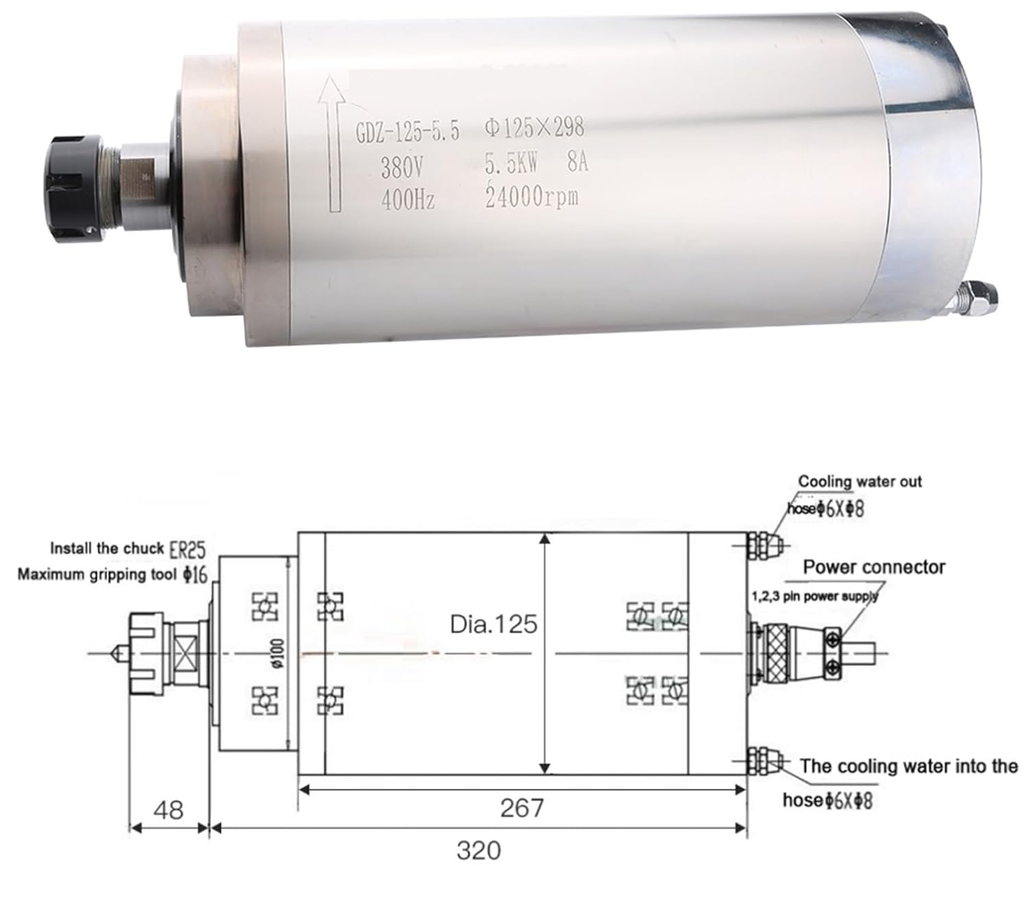 Industrial Motors1.80mmX225mm 2.2KW water cooled motor2.Rituo 2.2KW inverter3.Water pump 3.5meters4. holder 80mm>>Want to know the details and contact us immediately1.Size: 80mmX225mm2.Speed Ways: Through 3-phase output inverter and adjust the inverter frequency to change the speed.3.Cooling: Water cooling4.Power: 2.2kw5.Voltage: 220v/380v6.Frequency: 400Hz7.Rotating speed:24000r/min8.Water Cooling ER20 collet chunk