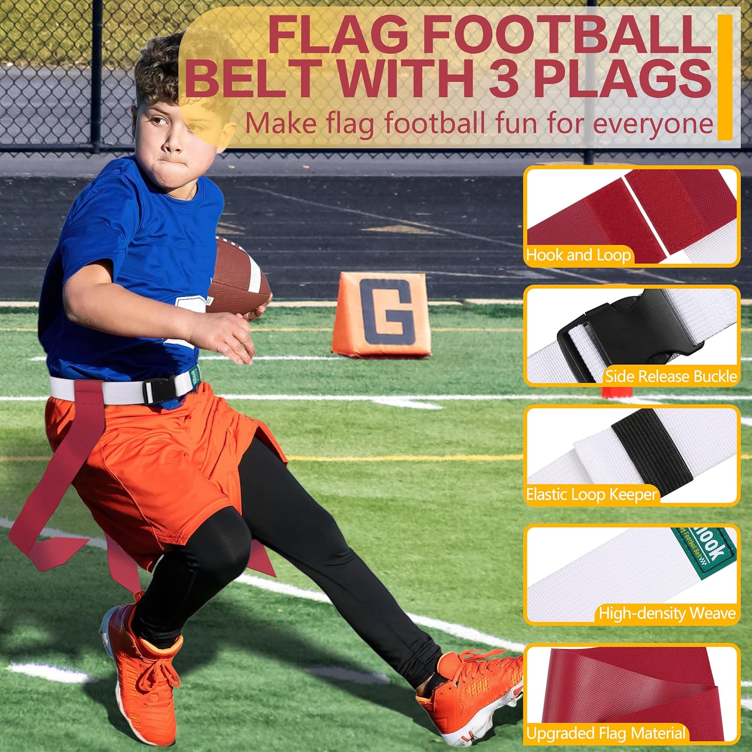 Flag Football Belts are suitable for use as kids flag football equipment and as an adult flag football set. Comprised of 24pcs 45" long adjustable football belts and 72pcs tags. Tags use hook and loop fastener for easy attachment and removal. Flag football sets can be suitable for off season training, can also be applied for a variety of games, such as hide and seek, pick up games, capture the flag, beach fun and more.