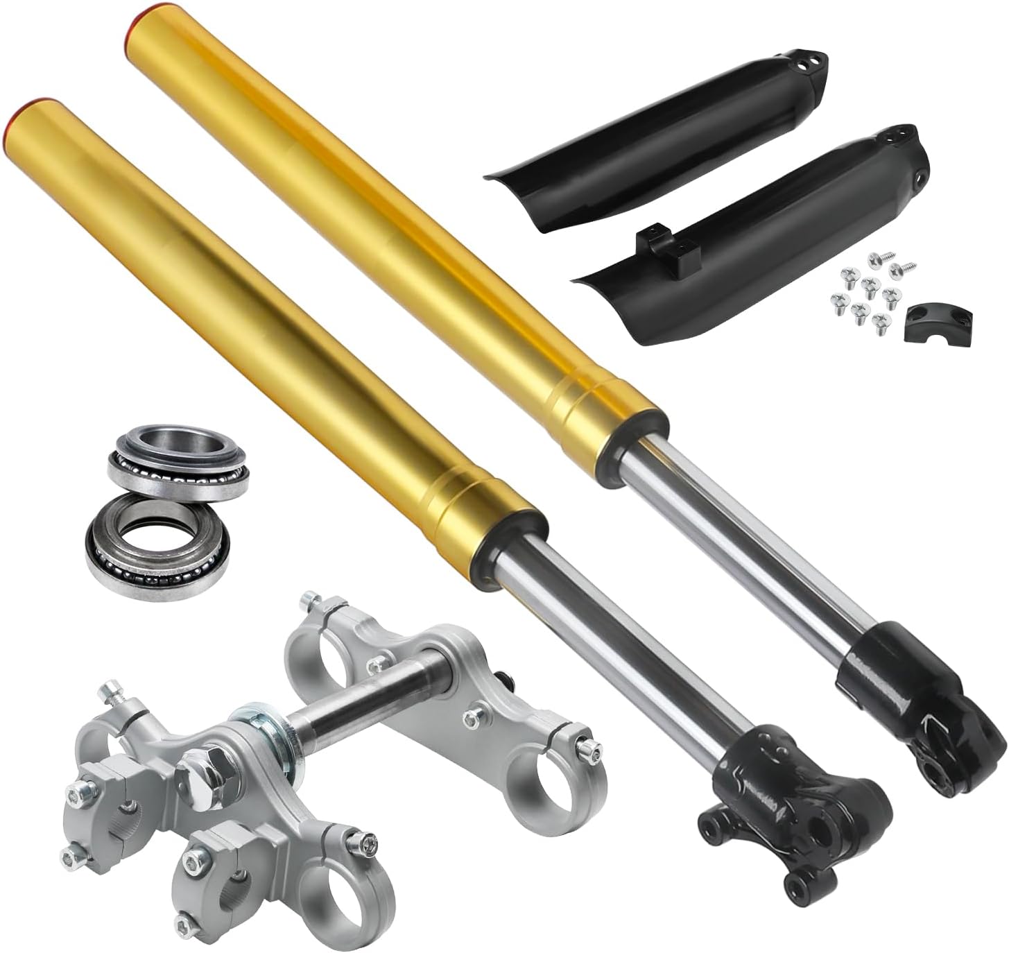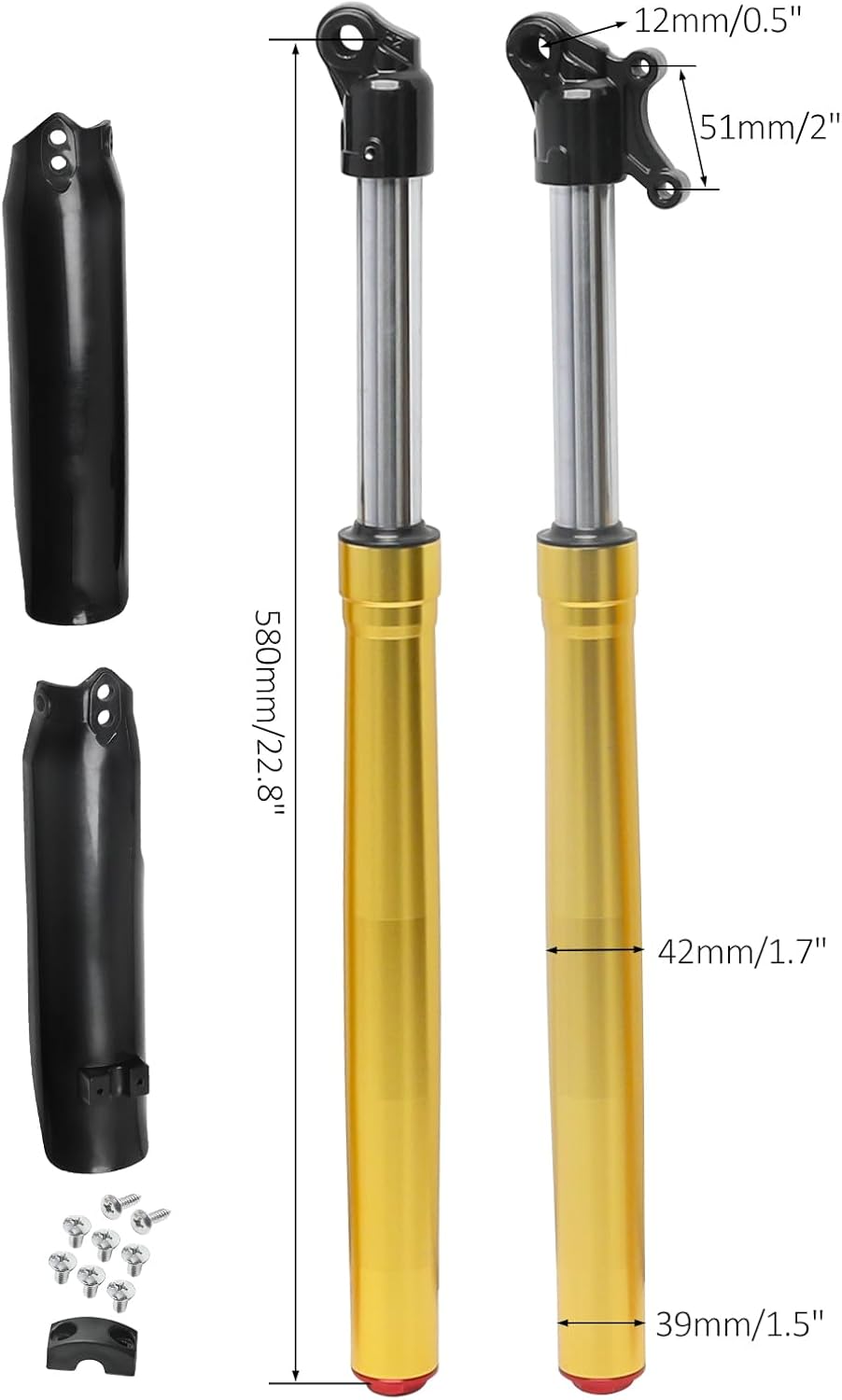 Front Fork Suspension: Color: Gold Material: Metal Type: upside down, Inverted Length: 580mm (22.8") Upper Diameter: 39mm (1.5") Lower Diameter: 42mm (1.7") Fit Wheel Axle Diameter: 12mm (0.5") Fitment: Fits 50cc 70cc 90cc 110cc 125cc pit dirt bikes, such as CRF50, XR50, SDG, SSR, Apollo, Taotao, Coolster, Razor, Roketa, Thumpstar and more Package Includes: A pair 580mm (23") front fork 39/42mm 1 x triple tree clamp