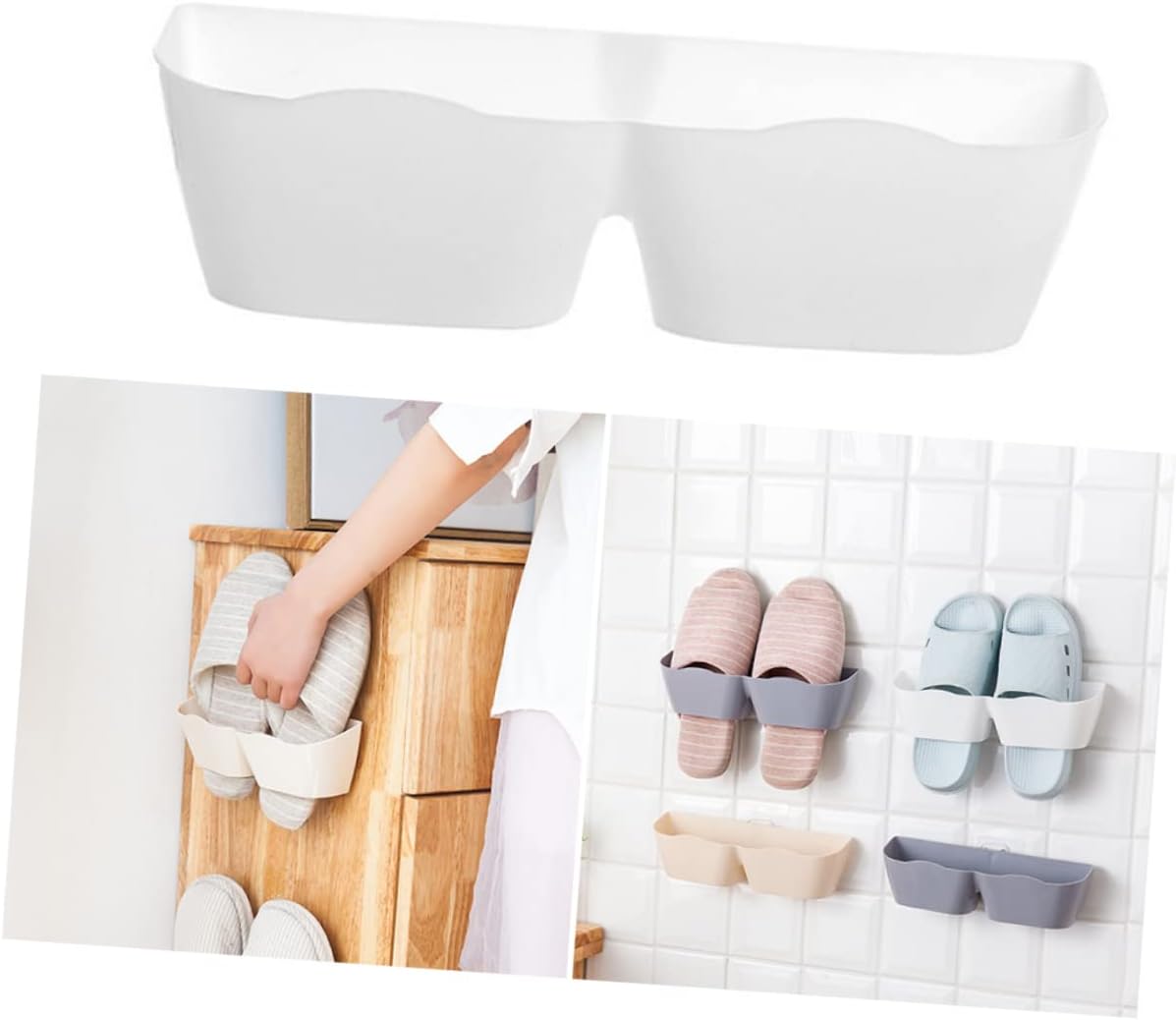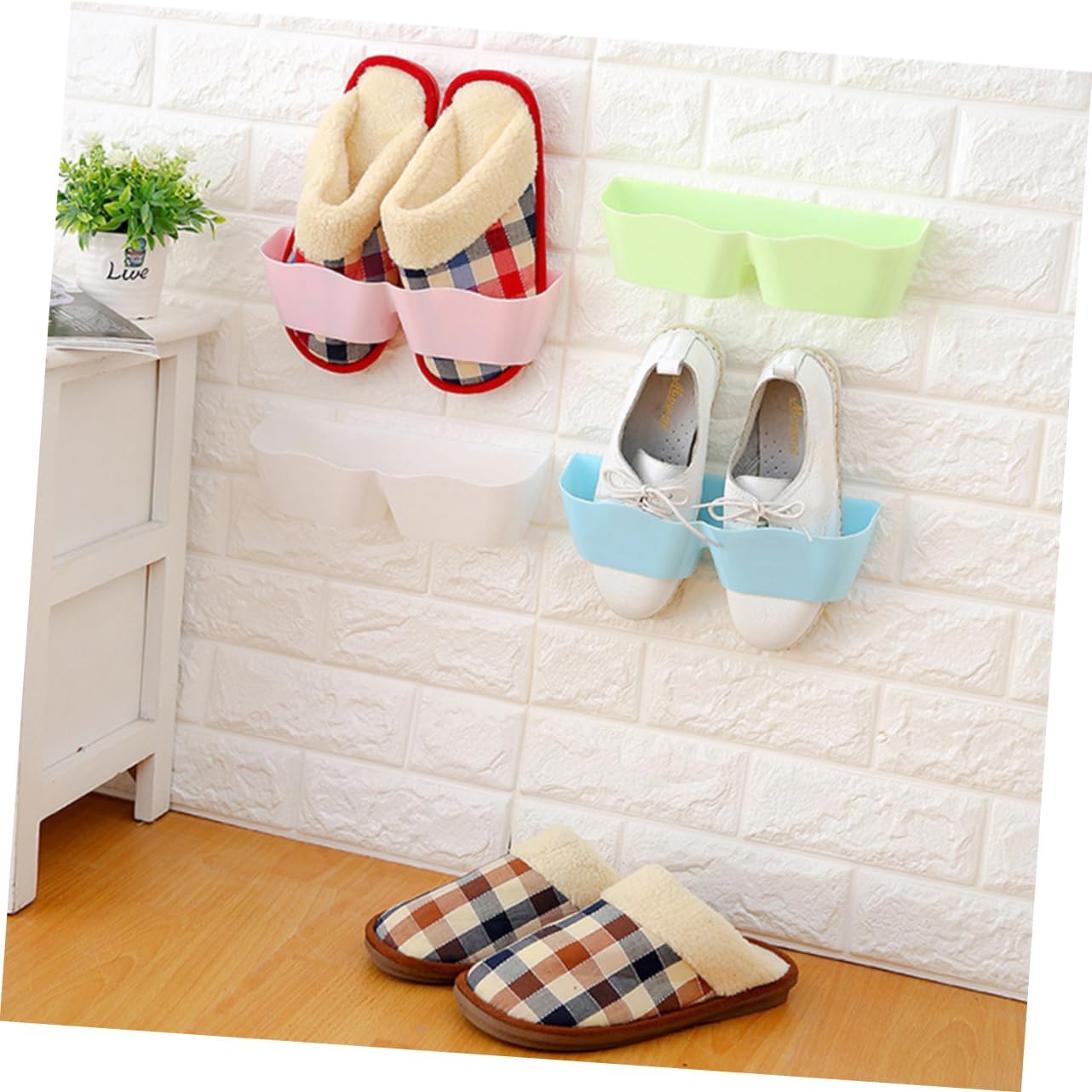Package Include br/ 4 * Creative Three-dimensional Wall Mounted Hanging Shoe Rack with Paste DIY Combination Shoe Storage Rack (White)br/ br/ Characteristics br/ - Color: White Wall shoe rack.br/ - Material: ABS plastic Shoe rack with paste.br/ - Size: 25.00X8.00X7.50cm;/9.82X3.14X2.95in;br/ - Great space saving , Easy assembly, no tools requires Shoes rack for entryway.br/ - With Strong double-sided adhesive, and Door shoe hangers organizer.br/ - Practial three-dimensional shoe rack with the paste, can hanger general size shoes Wall mounted hanging shoe rack.br/ - Sturdy and reliable construction. Can Hold on the wall long time.br/ - Protect shoes and damage.br/ - Space-saving, convenience, stong ability.br/ br/ Goods Informationbr/ Door shoe hangers organizer With sturdy and reliable construction, can hold on the wall long time and protect shoes and damage.Shoes rack for entryway Descriotion This item is a pair wall mounted hanging shoe storage rack, which is mede of ABS plastic, and