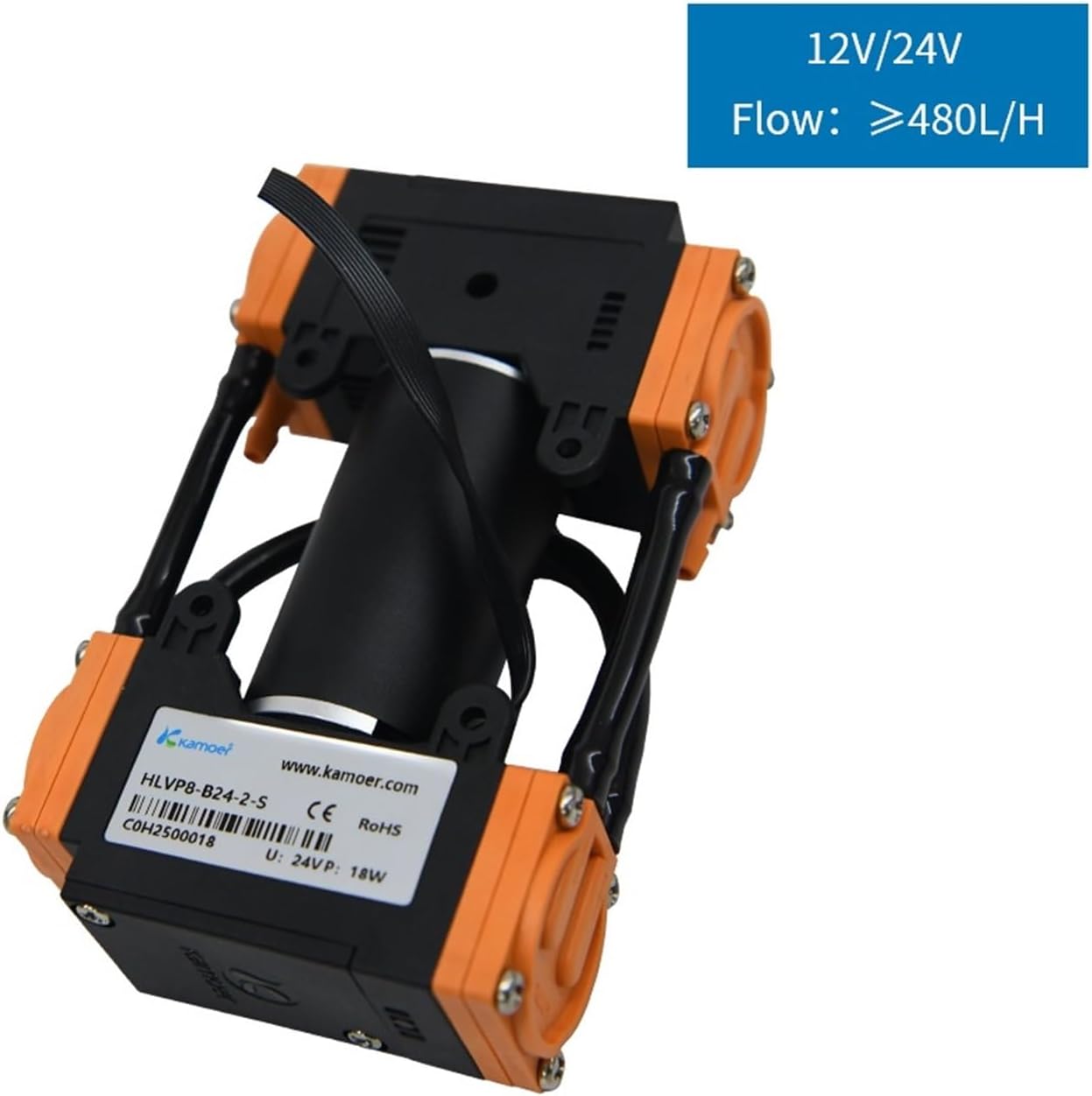 6-8L/min HLVP8 Diaphragm Vacuum Pump DC Motor Negative 0.098MpaLong lifeBrushless motorWide applicationMaintenance-freeLarge flowChemical stabilityDry runningBasic ParametersHLVP8-WB24/WB12HLVP8-WB24-S,HLVP8-WB12-SSeriesIn ParallelIn SeriesEffective flow L/min8L/min6L/minPower16W16WNoise72dB72dBControlmethodPWM; Fixed speedPWM; Fixed speedNet weight300g300gRated voltage12V/24V12V/24VMotor typeOuter rotor brushlessmotorOuter rotor brushlessmotorMotorlifetime6000H6000 HApplicableenvironment<;80%SupplementaryinstructionsThe above parameters are tested at standard atmospheric, room temperature 25°C, and the medium is air.Measured at a distance of 50cm under ambient noise of 35dBThe performance parameters of the product are affected by environmental conditions temperature, humidity, etc.), medium conditions (temperature, density, viscosity, chemical properties, etc.) and the load before and after the pump, so the above parameters may be different from the actual parameters.Optional accessoriesPU tube:ID4mmxOD6mm; 0.3mConnector: Straight 3/32Basic ParametersHLVP8-B24-2-SHLVP8-B12-2-SHLVP8-C24-2-SHLVP8-C12-2-SEffective flow L/H360L/H360L/H270L/H270L/HPower18W18W12W12WNoise75dB75dB75dB75dBNet weight385g385g360g360gRated voltage12V/24V12V/24V12V/24V12V/24VMotor typeBrushless motorBrushless motorBrushless motorBrushless motorMotorlifetime5000 H5000 H5000 H5000 HApplicableenvironment<;80%SupplementaryinstructionsThe above parameters are tested at standard atmospheric, room temperature 25°C, and the medium is air.Measure