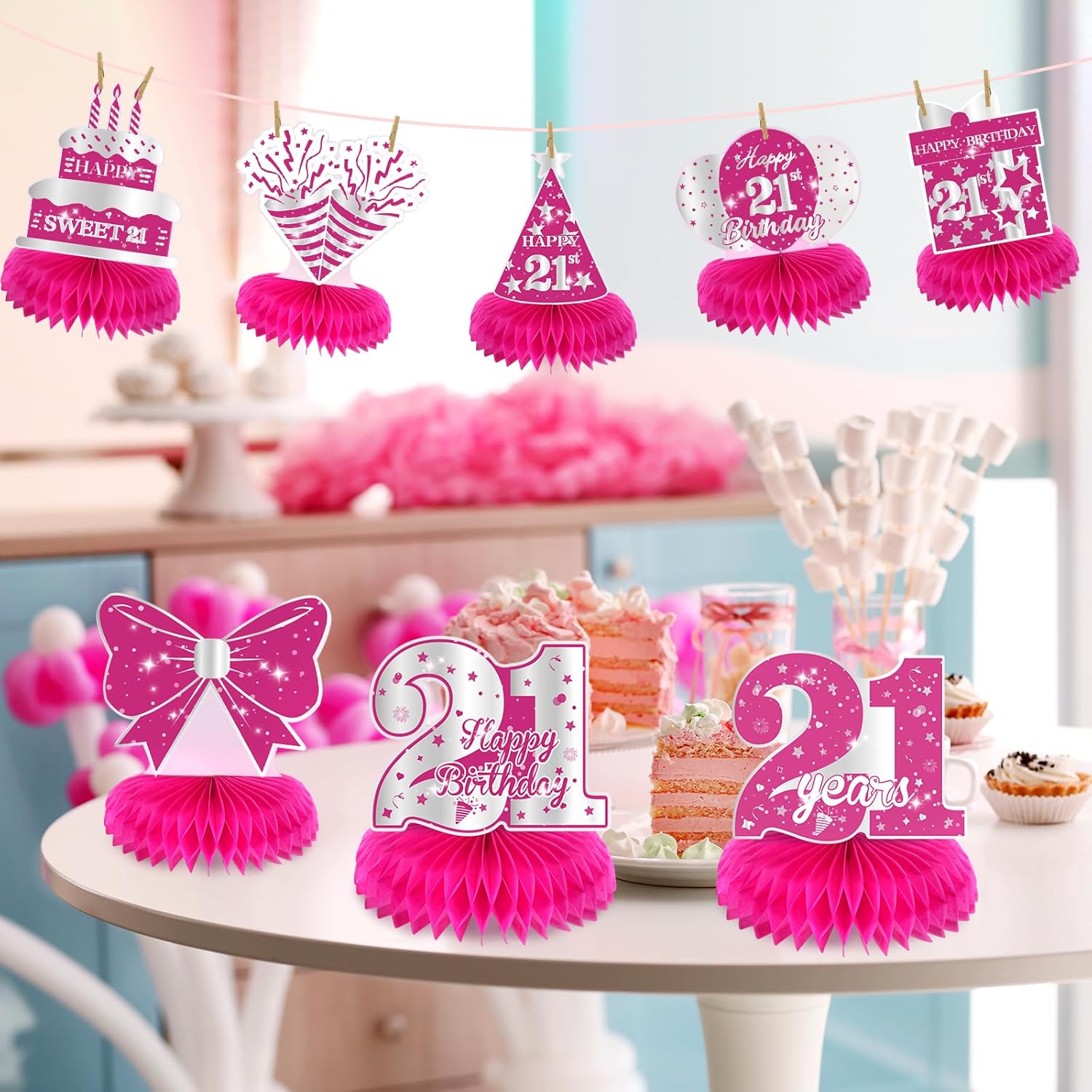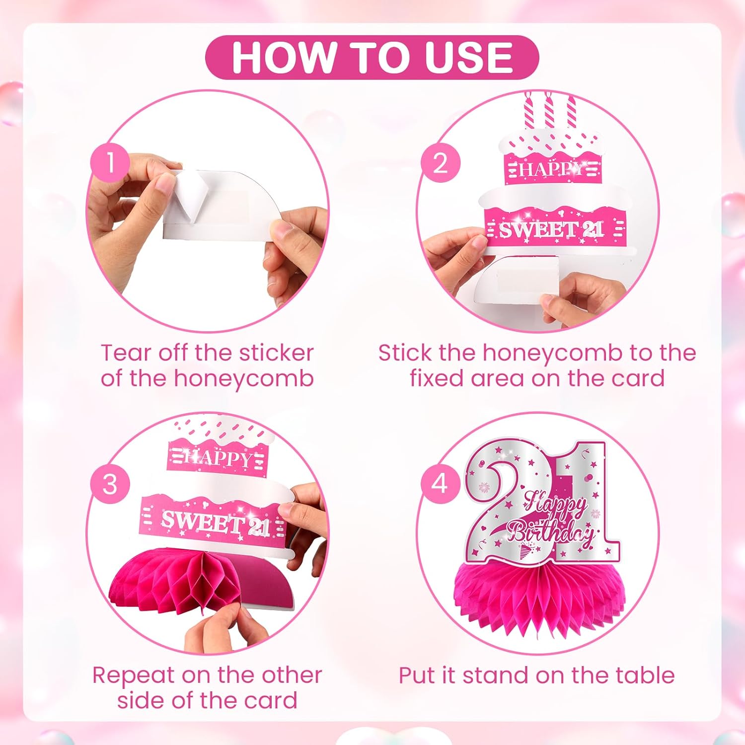 Features: This happy 21 birthday table centerpieces are pink birthday themes, it is suitable for birthday parties of girls, women, man and boys, it will make your birthday party more memorable and joyful.Occasion: The 21st birthday party table topper party supplies can be applied in a lot of fun occasions like pink themed 21st birthday party, anniversary party, costume party, cosplay party, indoor or outdoor birthday parties, shower, and table DIY decorations, etc.Specifications:Material: Paper cardstockSize: You can refer to the size images we provide.Color: Pink SilverPackage includes:8 x cardstocks8 x paper honeycombsNote:Due to manual measurement, please allow a slight deviation.There may be color differences due to different monitors.