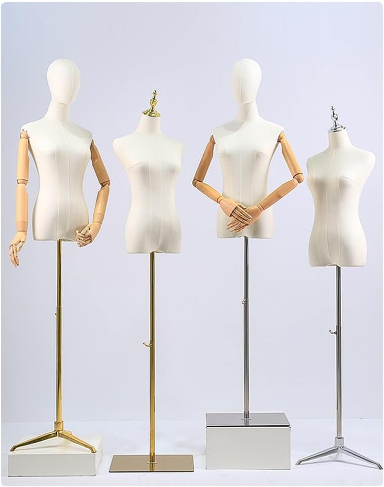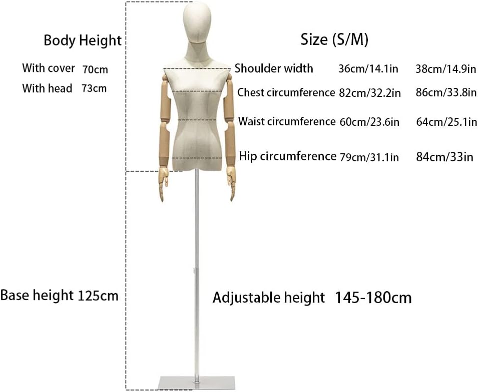 your retail displays our versatile mannequin stand, expertly designed to enhance visibility in various environments. This mannequin is ideal for clothing stores, craft fairs, and professional showcases, providing an impressive way to present your apparel and draw customer attention whether placed in store windows, on counters, or across the sales floor.**Key Features:**1. **Adjustable Height:** Easily customize the mannequin’s height from 140 to 180 cm (55.1 to 70.8 inches) to meet your specific display needs.2. **Versatile Applications:** Perfect for a range of settings, including boutiques, shopping malls, art exhibits, and training classrooms.**Product Details:**- **Type:** Half-body mannequin (female model also available)- **Material:** Made from durable fiberglass with a sturdy metal base for optimal stability- **Fabric:** Soft linen covering adds elegance and sophistication to your display- **Assembly:** Quick and easy setup ensures a hassle-free experience- **Arm Material:** Lightweight plastic for effortless adjustments- **Model Variations:** Available with crown, hand, or both hand and head options**Size Information:**- **Size S:** Shoulder Width: 36 cm (14.1 in), Chest: 82 cm (32.2 in), Waist: 60 cm (23.6 in), Hips: 79 cm (31.1 in)- **Size M:** Shoulder Width: 38 cm (14.9 in), Chest: 86 cm (33.8 in), Waist: 64 cm (25.1 in), Hips: 84 cm (33 in)**Package Includes:**- 1 x Model Stand**Note:** Please allow a measurement error of 1-3 cm due to manual measuring.