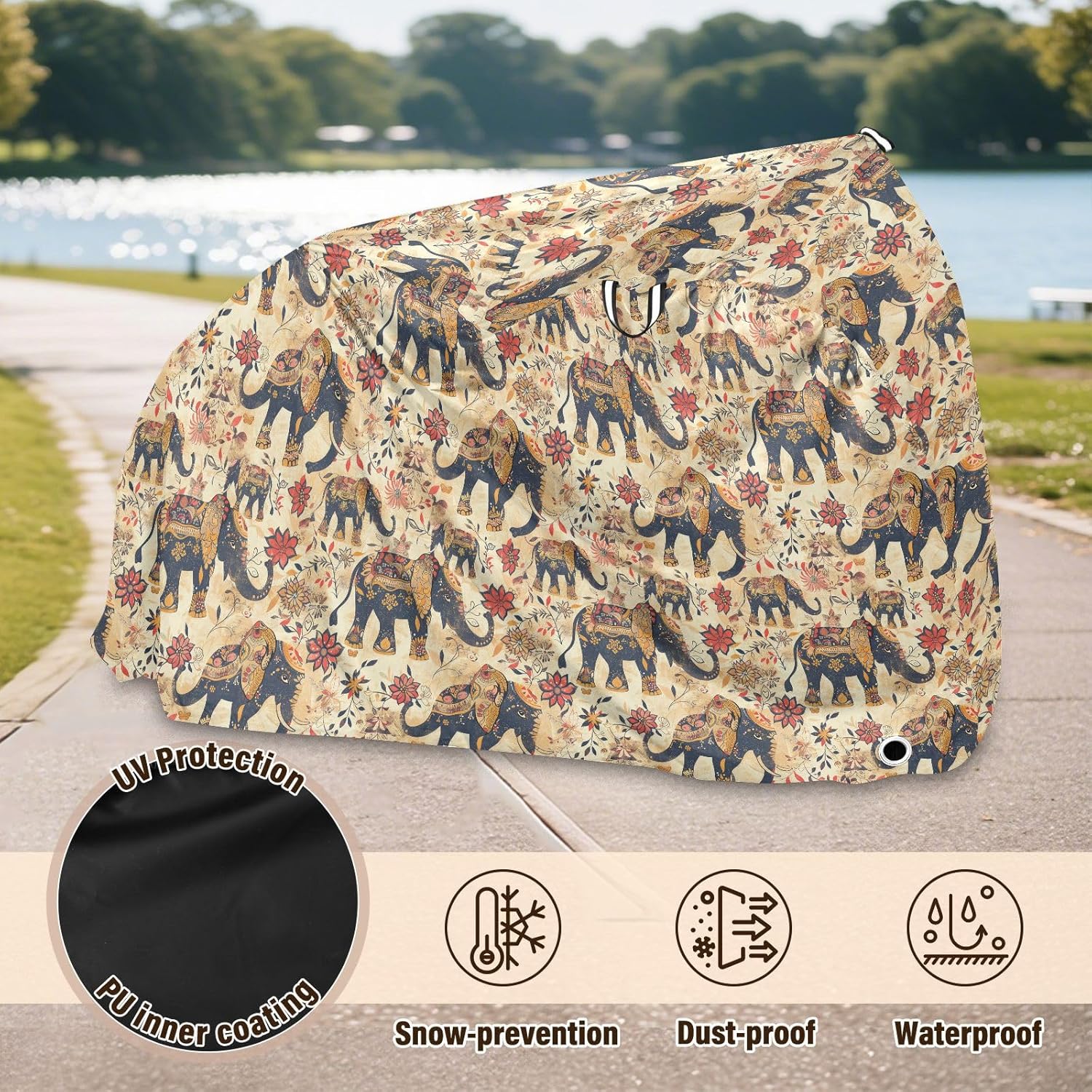 Protect your bicycle in style with our premium bike tarp, engineered for maximum defense against harsh elements. Unlike basic covers, we use specially engineered umbrella waterproof fabric - the same advanced material used in high-end rain umbrellas - delivering superior performance with unique visual appeal. Sun & Heat Defense Our fabric creates a physical cooling barrier that actively lowers your bike's temperature by: Blocking 95%+ harmful UV rays to prevent paint fading Providing exceptional shading & heat insulation (up to 20℉/11℃ reduction vs direct sun) Offering SPF 50+ equivalent protection for sensitive components Rain & Dust Protection Water-repellent coating causes rain to bead and roll off Tightly woven fabric acts as dustproof barrier for long-term storage Prevents moisture buildup with breathable side panels (prevents condensation) User-Focused Design LOCK ACCESS HOLE at front wheel enables secure locking without removing cover ADJUSTABLE BUCKLE STRAP at rear wheel anchors cover during strong winds Reflective safety strips on handles enhance nighttime visibility Ultra-lightweight (23 oz) folds into included pouch Unbeatable Aesthetics Choose from over 1,000 designer patterns - from sleek geometrics to vibrant nature motifs - transforming your bike into a street-style statement while competitors offer only solid colors.
