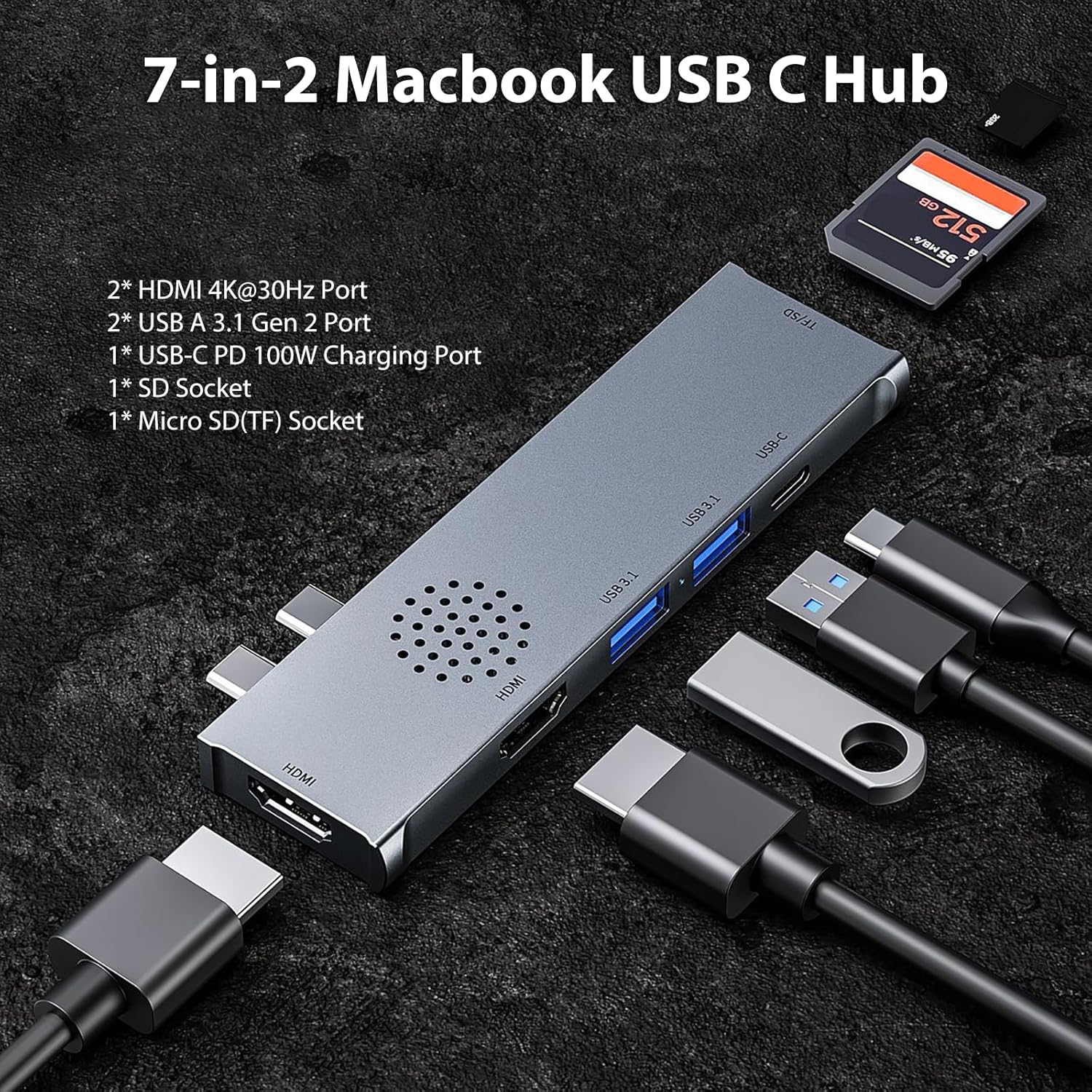Designed for Macbook Pro/Air: Exclusively designed for Macbook Pro 16-inch 2019-2023, Macbook Pro/Air 15-inch 2016-2023, Macbook Pro/Air 13-inch 2016-2023. With aluminum alloy shell, lightweight and durable. 7-in-2 Macbook USB C Hub: The USB-C adapter extend two ports of your Macbook to 7 other ports. Includes 2* HDMI 4K&2K@30Hz port, 2* USB 3.1 Gen 2 port, 1* 100W PD charging port, 1* SD socket, 1* Micro SD (TF) socket. *Note: The 100W PD port only support charging, do not support data transfer. Ultra HD 4K Output & Triple Display: This docking station features 2 HDMI ports for high definition 4K 30Hz video on TV, monitor or projector. You can also change different resolutions according to your devices. Heat Emission Holes Design: With aluminum alloy case and heat emission holes, keep the hub cool during operation and ensure stable work. Plug and play. No driver needed. High Speed Data Transfer: USB A port, USB 3.1 Gen 2, up to 10Gbps data transfer speed. SD & Micro SD (TF) socket, up to 480MB/s. *Note: SD and Micro SD can't be used at the same time.