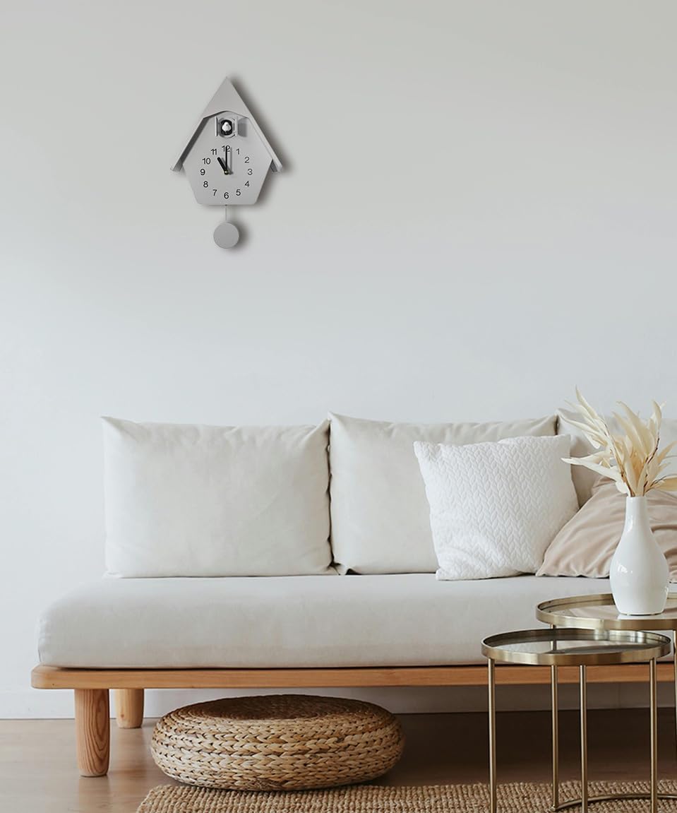 The "Domo – Cozy Cuckoo" clock takes inspiration from charming birdhouses, combining classic cuckoo clock features with a modern, minimalist style. With its cheerful hourly cuckoo call, this clock brings a playful and lively touch to your daily routine. The clean, easy-to-read numbers and gentle pendulum add both convenience and warmth to your home. Perfect for any room, from your cozy living room or dining area to a playful children's room, "Domo – Cozy Cuckoo" quickly becomes a beloved highlight. It adds character, charm, and joy, making it an ideal decorative piece as well as a delightful companion for your family's everyday moments. Make every hour feel special with "Domo – Cozy Cuckoo," and turn checking the time into a delightful, heartwarming experience!