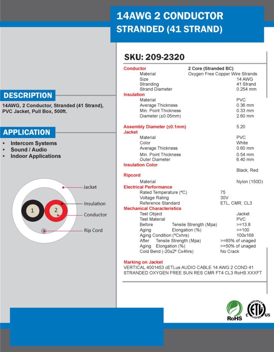 Upgrade your audio system with this heavy-duty V-Sound 14-AWG Audio Cable from Vertical Cable. Featuring 2 stranded conductors (41 strands each) and a PVC jacket with sequential length markings, it delivers powerful, high-quality sound. Ideal for high-power audio applications, this cable offers exceptional performance and durability and comes in a 500-ft. pull box.