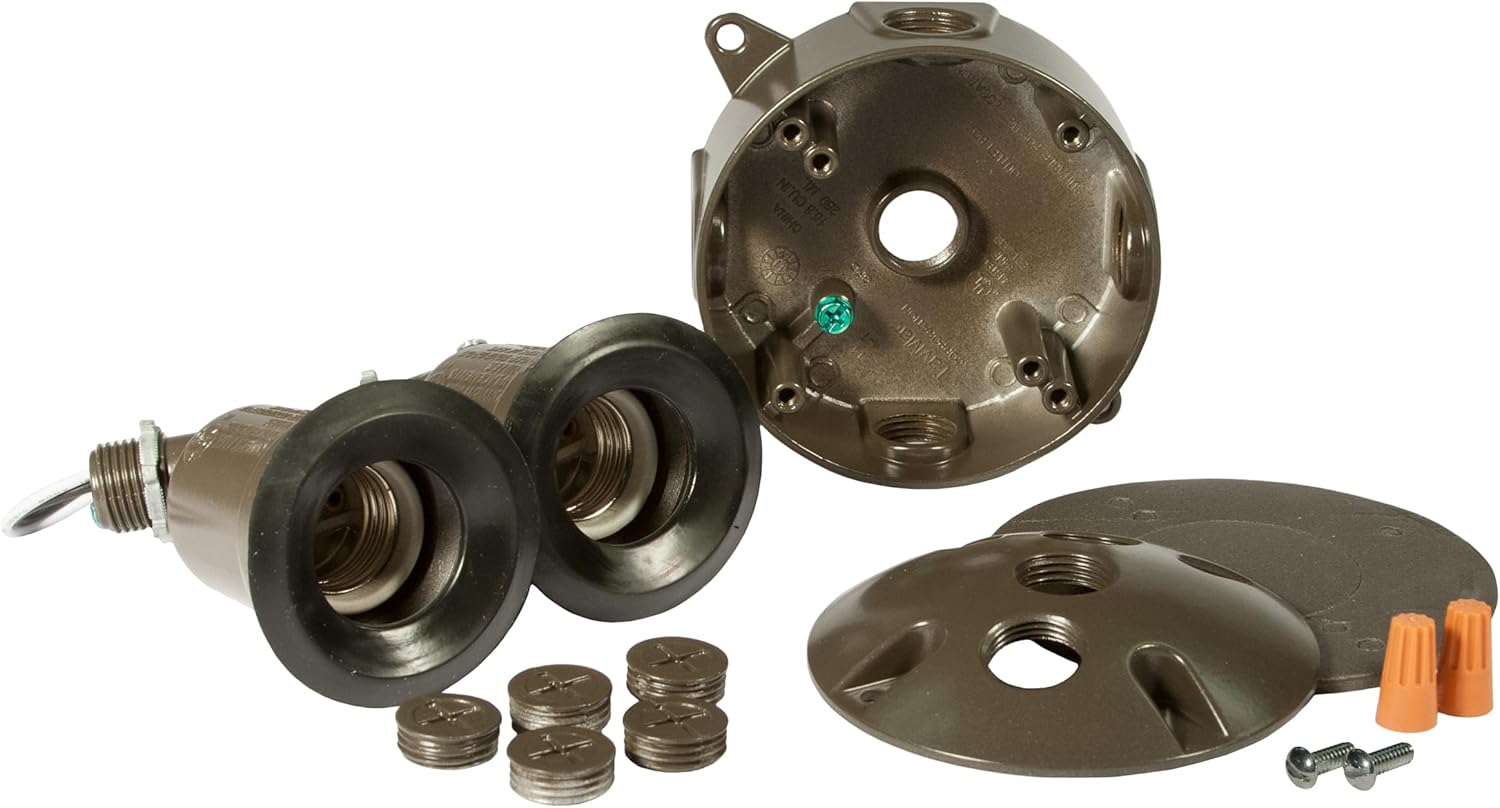 Bell weatherproof light kits provide weatherproof protection for general outdoor lighting applications. Light kits are suitable for wet, damp, or dry locations. The kits are complete with a 4 inch round bell box, cover, and two lampholders.