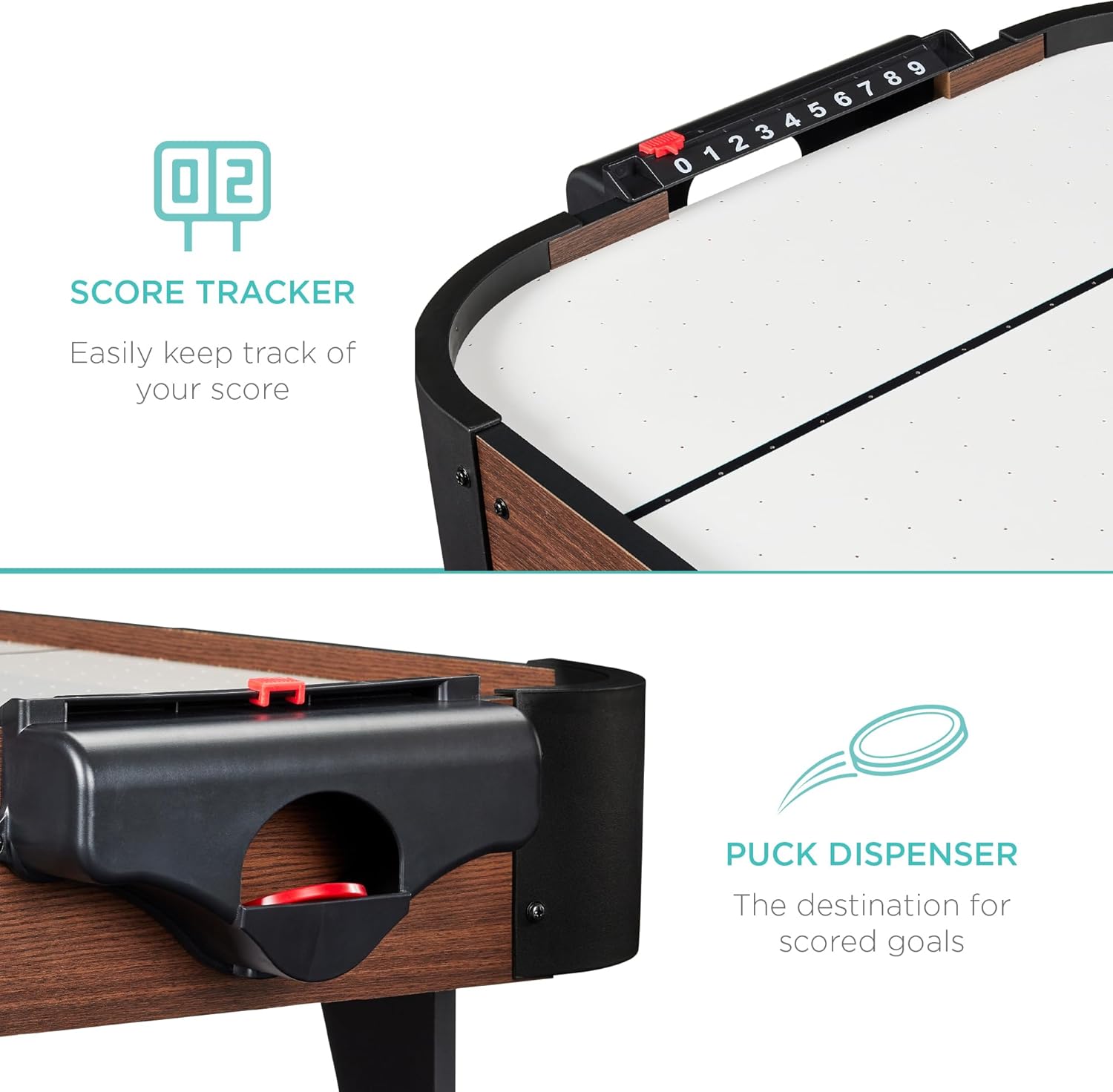 • ABACUS SCORER: Designed with manual sliding scorekeepers and goal boxes, plus a convenient puck return on each side; 2 strikers and 2 pucks also included