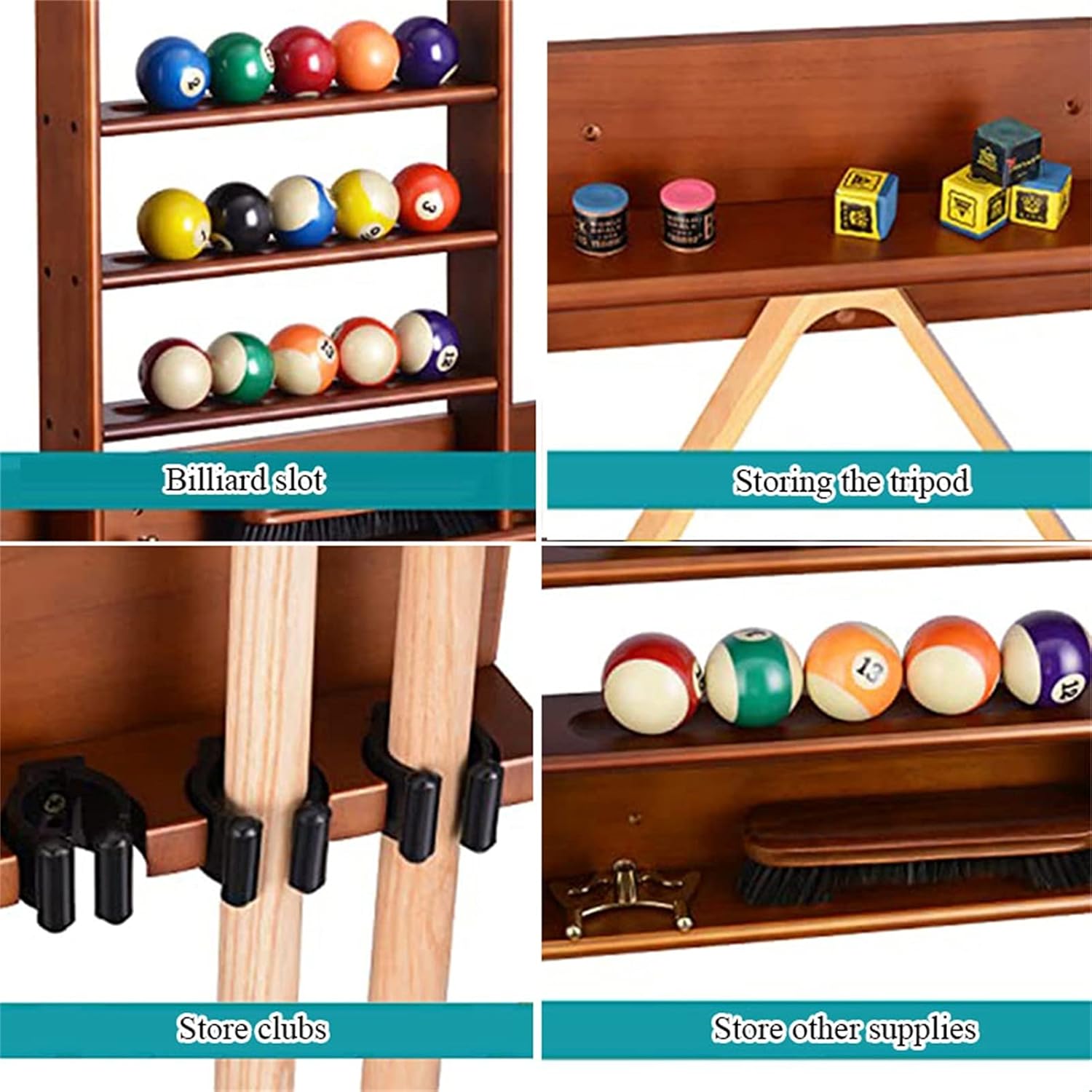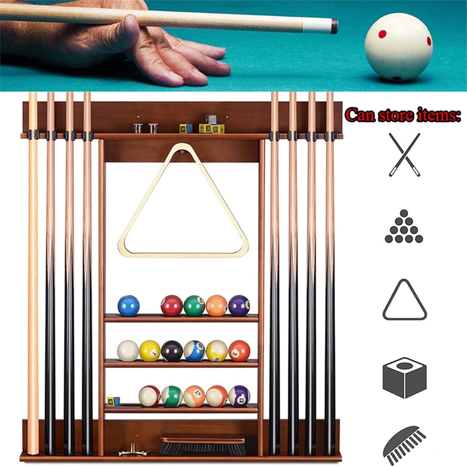 [Parameters] Material: wood Function: Billiard accessories. We only sell holder. The cue in the picture is just to show the function of the product. Why choose our products? - Supplied with screws, easy to install. easy and convenient. - Effectively protect the club, reduce deformation, easy to store the club。 -This shelf can hold billiard cues, a set of standard billiard balls, a triangular frame, chocolate powder, billiard table brushes, etc. [GUARANTEE] ? sincere after-sales service. Your satisfaction is our greatest success! ? If you have any questions, please feel free to contact us. I express my sincere welcome!