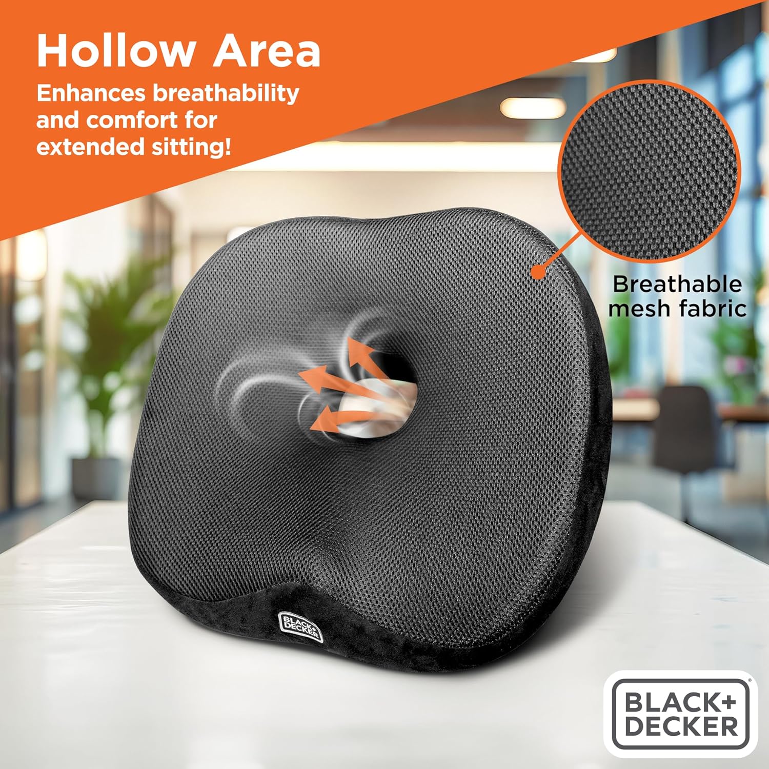 Experience ultimate comfort with the BLACK+DECKER High Back Tailbone Seat Cushion, designed for tailbone pain relief and sciatic support. Made with slow rebound memory foam, this ergonomic seat cushion evenly distributes weight to reduce pressure, promote proper posture, and alleviate discomfort from prolonged sitting. Its breathable mesh fabric keeps you cool, while the universal fit makes it perfect for office chairs, desk chairs, gaming chairs, car seats, wheelchairs, and airplane seats. Whether you're at work, commuting, or gaming for hours, this memory foam seat cushion ensures lasting comfort. The removable, washable cover keeps it fresh, and its lightweight, portable design makes it ideal for travel. If you're looking for a butt pillow that supports your tailbone and reduces pressure, this car seat cushion is your perfect solution! Perfect for: Work, Home, Travel, and Long Hours of Sitting Upgrade your seating with the BLACK+DECKER Tailbone Seat Cushion today!