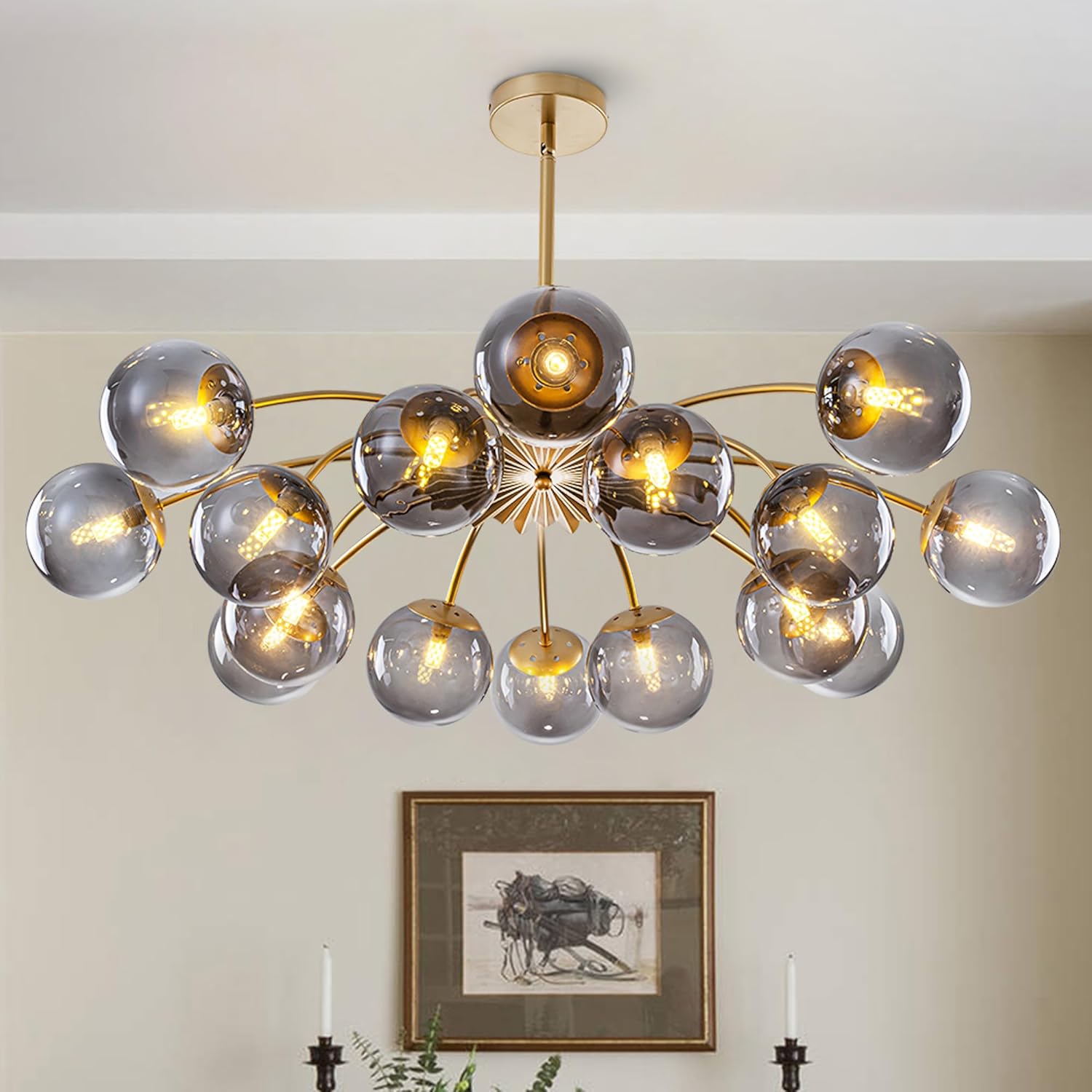 Mid-Century Modern Sputnik Designs opulent fusion of classic Sputnik and elegant bubble design, this 12-light semi-flush chandelier features gracefully curved arms cascading from the back of a medal-like base to support alluring smoked glass globes, like a beautiful blossom firework. Warm cozy lighting sweeps down to your space when we turn on this glass globe sputnik chandelier, flowing through frosted glass bubbles and the luxe gold frame with elegance. Perfect to add artful charm and sophisticated beauty to your home decor and low ceiling, this 12-ight opal glass bubble chandelier funky chandelier is the best enhancement to a living room, dining room, entryway, bedroom, orlobby.