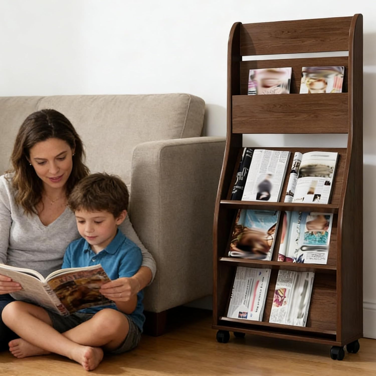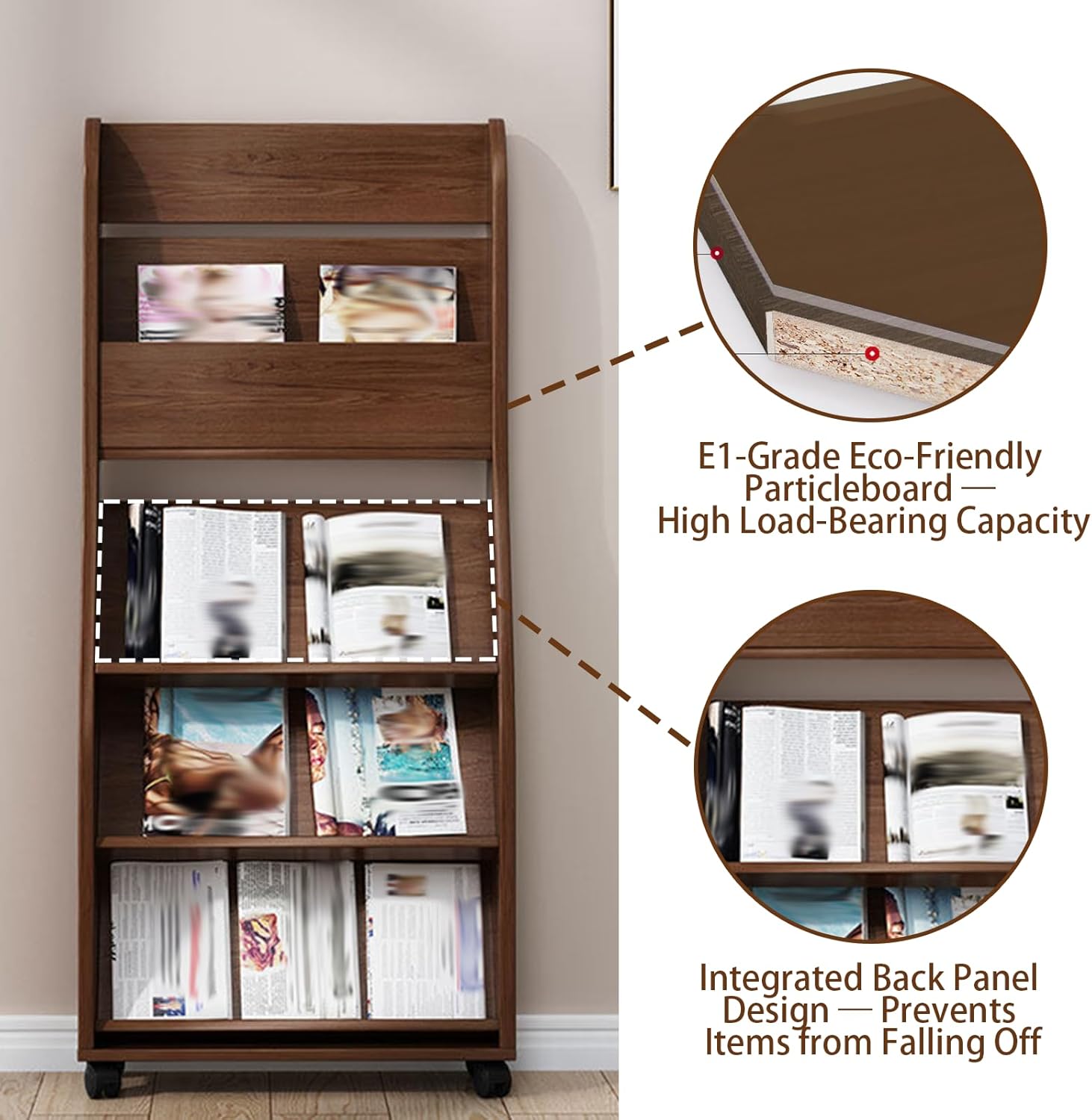 Product Description:The brochure display rack features a four-tier, high-capacity design equipped with spacious, angled open shelves that keep your various reading materials clearly visible and within easy reach. As a practical floor-standing magazine rack, it excels at both organizing and displaying a wide range of reading materials. Furthermore, its integrated back panel design effectively prevents items from sliding off, ensuring that your display remains neat, orderly, and securely stable.Features:1. 360° Swivel Casters with Locking Brakes;2. E1-Grade Eco-Friendly Particleboard with High Load-Bearing Capacity;3. Integrated Back Panel Design to Prevent Items from Falling;4. Display Rack for Brochures, Newspapers, and Catalogs—High-Capacity Design;5. Slim, Floor-Standing Structure—Space-Saving Design.Product Information: Product Name: Brochure Display Rack Material: Wood Applicable Scenes: Suitable for a Wide Variety of SettingsImportant Notes:1. Color Variation: Due to differences in photography lighting and monitor color calibration, the actual color of the product may differ slightly from the images shown; this is considered a normal occurrence.2. Size Variation: Due to differences in measurement standards, a size discrepancy of 1–3 cm is considered a normal occurrence.3. After-Sales Service: Should you encounter any issues during installation, our customer service team is available to assist you within 24 hours.