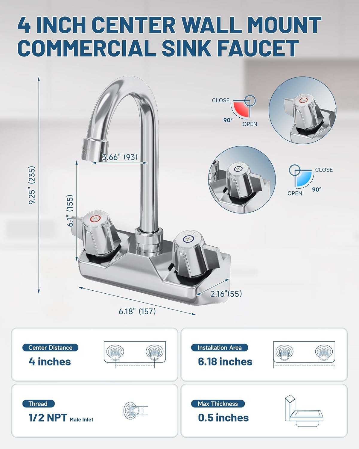 BWE Commercial Kitchen Faucet Wall Mount 2 Handle Kitchen Sink Faucet 4 Inch Center Sink Faucet with Swivel Gooseneck Spout for Utility Laundry Restaurant Mixer Tap Chrome