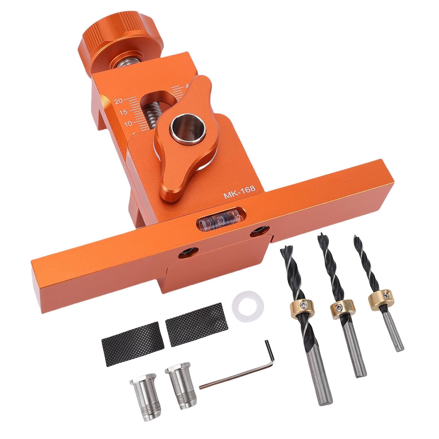 [Enhanced Stability] Equipped with an extended crossbar and non-slip pads, this wardrobe door mounting jig provides enhanced grip and stability, preventing unwanted movement for precise adjustments. [Accurate Installation] The integrated level bubble allows for quick surface flatness checks and precise door angle adjustments, making installation seamless and accurate. [Dual Functionality] Featuring two-sided measurement scales for door alignment adjustments and rebound drill hole positioning, this adjustable cabinet door jig offers convenience and efficiency in one compact tool. [Durable Aluminum Alloy Construction] Made from solid aluminum alloy, this cabinet door installation jig is sturdy and reliable, ensuring long-lasting performance for professional results. [Easy Installation] Calibrated markings on the door panel mounting jig simplify the installation process by enabling users to set the top position to the exact midpoint, with a tightening knob for centering. Spec: Item Type: Cabinet Door Installation Jig Product Material: Aluminum Alloy Package List: 1 x Cabinet Door Installation Jig 2 x Non Slip Pads 1 x Plastic 2 x Drill Bushings 3 x Drill Bits (With Depth Stop) 1 x Wrench