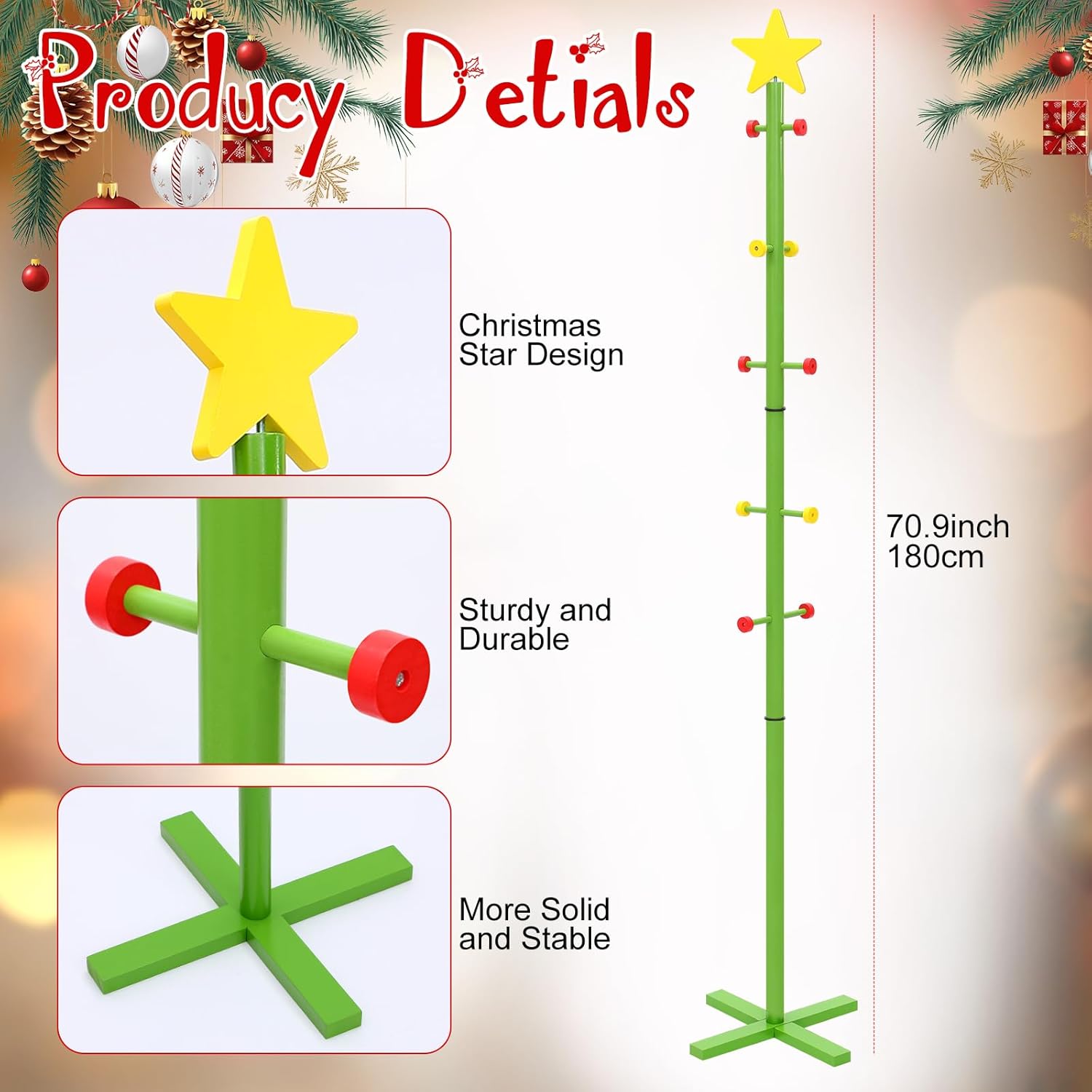 Features: Versatile use: Multiple hanging rods are distributed on the pole, adding a sense of layering and fun to this Christmas decoration. Additionally, you can place it in the entryway to organize guests' scarves, hats, coats, shoes, and more. As a standing coat rack, it is also a good choice. Easy storage: Our Christmas supplies comes with installation instructions. An intuitive, straightforward design allows you to assemble this set in minutes. Specifications: Material: wood Color: multicolour Size: (about) 70.9 inch / 180 cm Package includes: 1 x Christmas wooden stocking holder Notes: Manual measurement, please allow slight errors on size. Due to the screen display, the color of the item may differ slightly from the picture