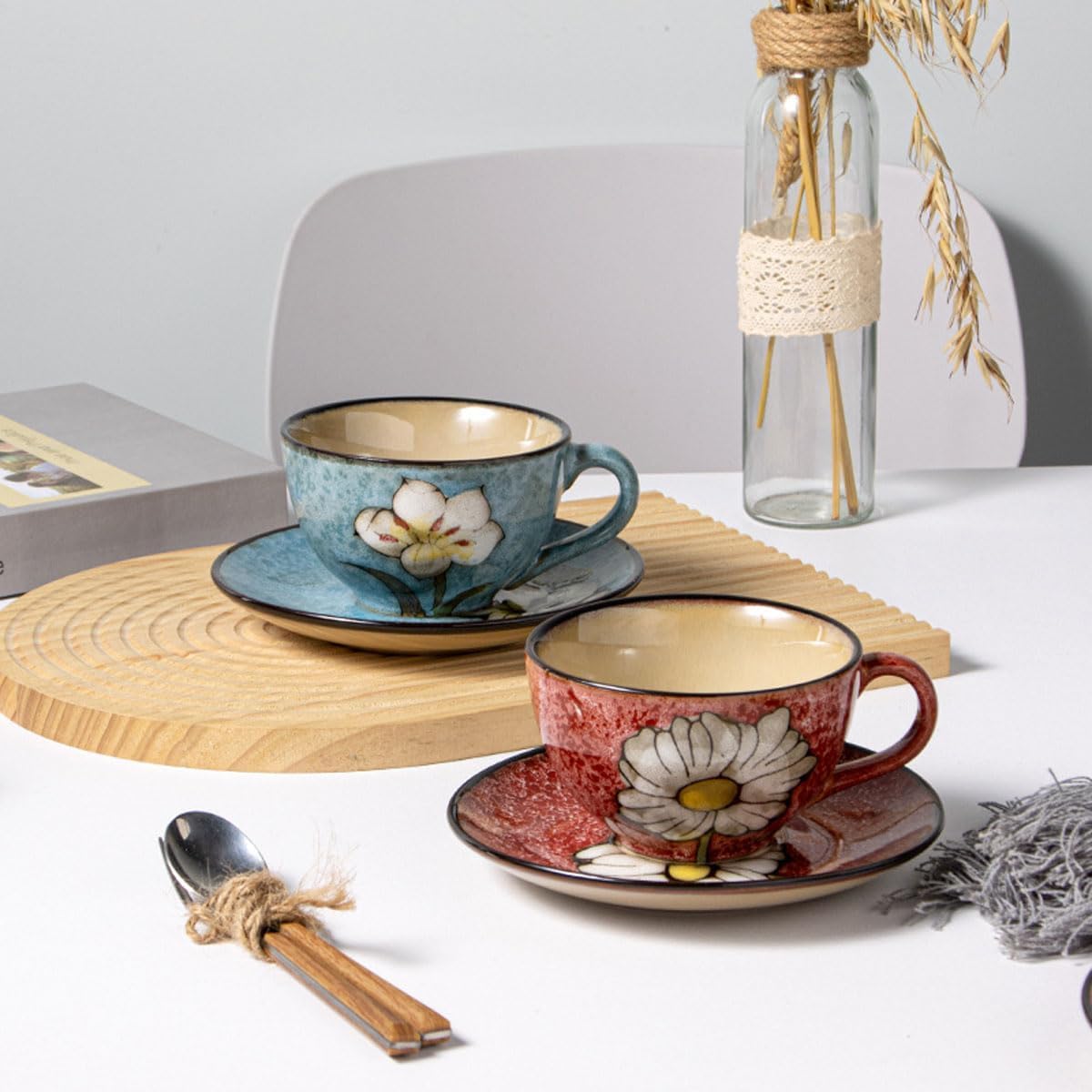 Bring a touch of color and charm to your coffee time with this Vintage Ceramic Coffee Cup and Saucer Set. Each cup features a unique hand-painted floral pattern in vibrant colors—red, green, blue, and orange—that brightens your table and adds a stylish, artistic flair to your daily routine. Made of high-quality ceramic, these cups are durable, lead-free, and safe for everyday use. With a generous 9oz capacity, they are perfect for cappuccinos, lattes, espressos, teas, or hot chocolates. Each set includes a matching saucer that not only complements the design but also makes your coffee experience more convenient by catching drips or holding cookies and teaspoons. This colorful coffee cup set is both dishwasher and microwave safe, making it practical for modern living while retaining a timeless, vintage charm. Whether for your own kitchen or as a thoughtful gift for housewarmings, weddings, or birthdays, this set will delight any coffee or tea lover.