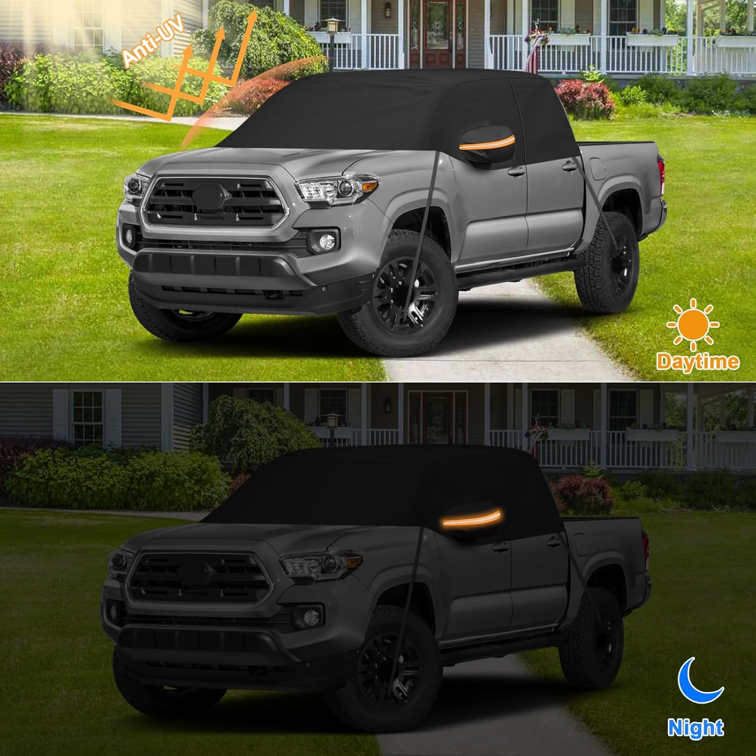 Kistrba Car Cover for Mid-Size Truck Crew Cab, Truck Cab Cooler Sunshade Roof Cover Compatible withPremium Quality & Durability Material: (6-Layer) 1. Constructed from the outermost layers of PE & polyester, delivering complete waterproofing. 2.Utilizes high-reflective aluminum and double-layer PEVA for excellent sun protection, maintaining a cool interior on heat days. 3.Lined with PE and soft cotton inside to safeguard your car's paint job.