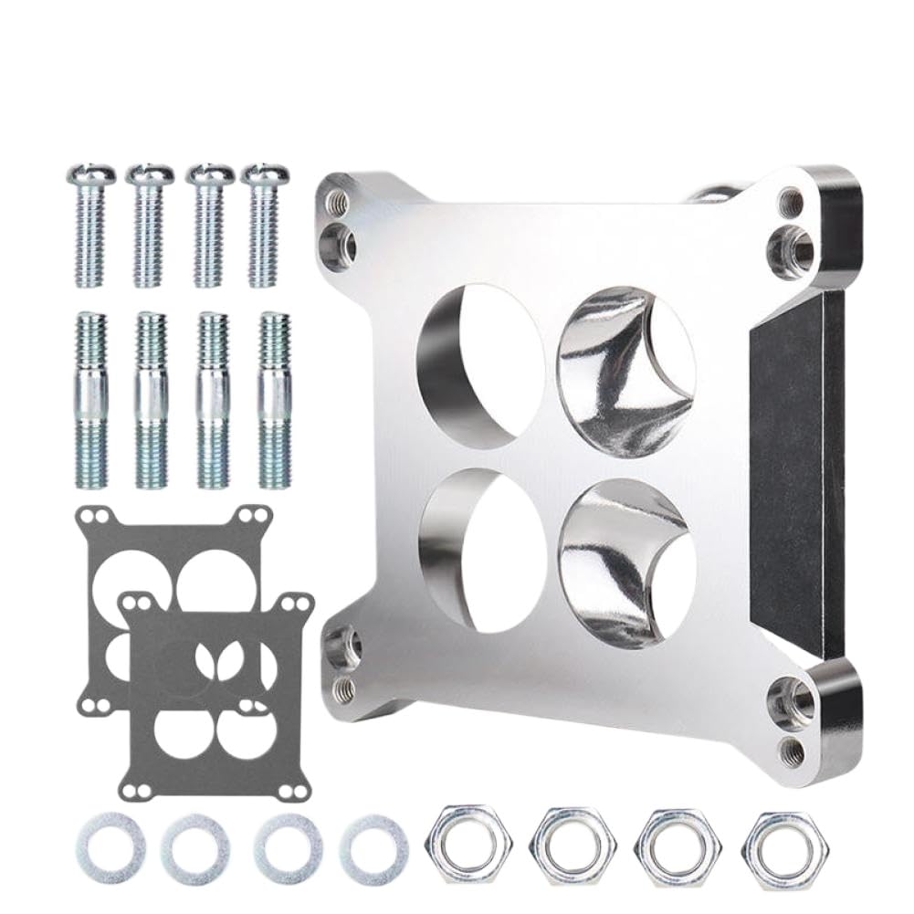2696 Carburetor Spacer Four-Hole Square-Bore to Spread-Bore For Quadrajet & Thermo-Quad Manifold Base 0.85in Venturi Enhance engine performance with the 2696 Carburetor Spacer, designed to improve airflow in the intake system.This adapter enables the use of a four-hole square-bore carburetor on a spread-bore Quadrajet or Thermo-Quad manifold.Constructed from aluminum , the spacer features a natural finish and a thickness of 0.850 inch, a secure fit between the carburetor and manifold.Individual venturi ports are incorporated to support efficient fuel delivery. The spacer is compatible with Quadrajet and Thermo-Quad carburetors and includes provisions for vacuum port alignment.A 1/8 inch hole can be added to accommodate vacuum flow as needed.Gaskets and hardware are included for installation.The design allows for direct mounting while maintaining proper sealing and alignment with the intake manifold. This product is an aftermarket solution.Brand names are mentioned only to clarify compatibility with specific models.