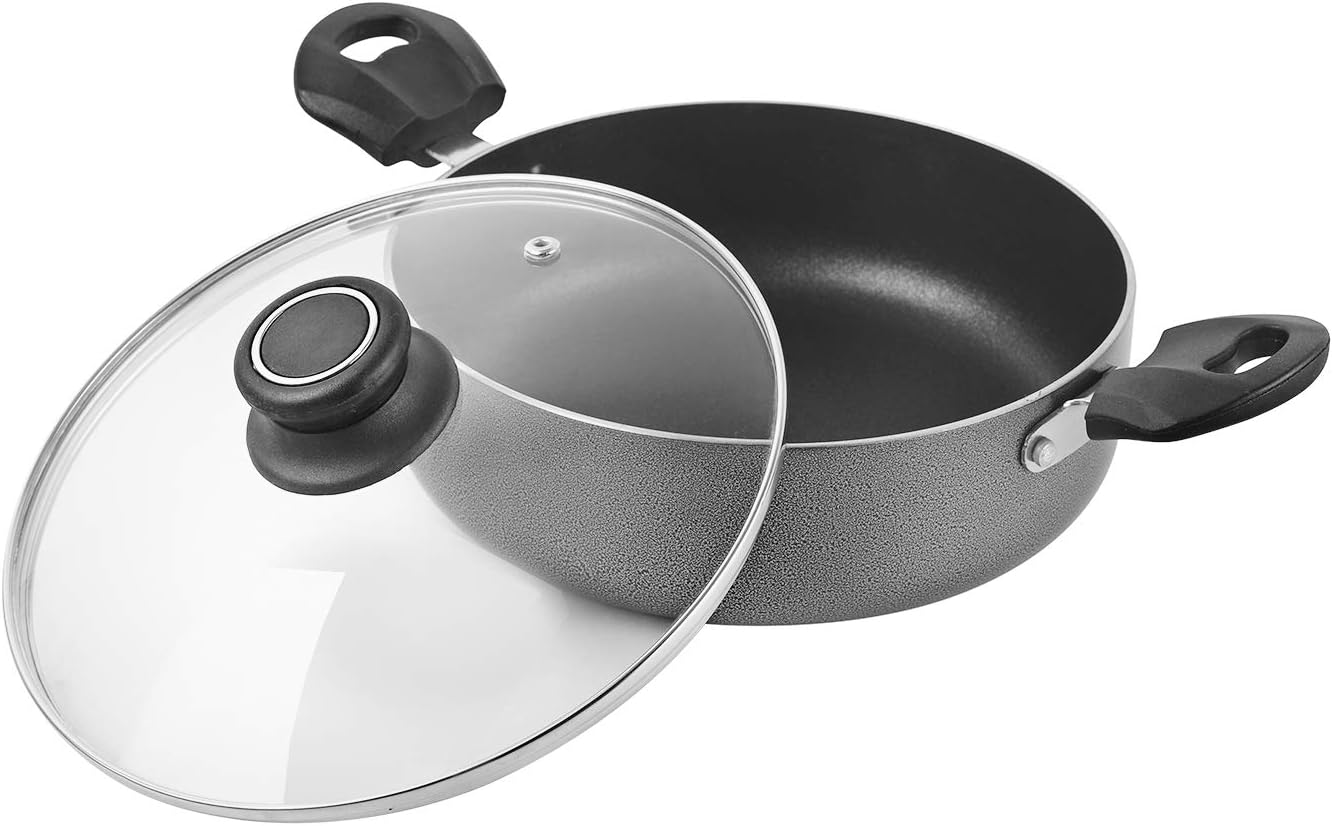 Prepare healthy meals easily with Cello’s 3 pcs nonstick cookware set. Available in a striking hammertone color this cookware set will definitely add a charm to you kitchen collection. This nonstick cookware set is made of American heritage original dupont coating. The set consists of dosa tawa, fry pan and kadhai with a tempered glass lid. One can cook and fry varieties of food like dosa, roti, curry, paneer rolls and more on this essential cookware set. Cello nonstick cookware set needs lesser oil making the food you cook in it healthiers and tastier. Its high gauge aluminum adds to its cooking efficiency by evenly distributing heat. This cookware set has a sturdy handle made of bakelite and is compatible with both lpg stoves and induction. The other notable feature is that the lid has an air vent or steam hole that provides security by releasing extra pressure of steam while cooking. Now revolutionize your cooking experience with the Prima 3pc cookware set by Cello.