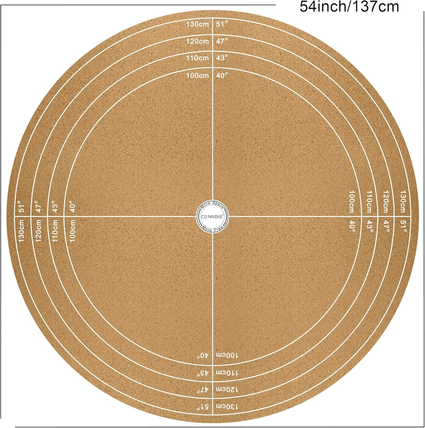 • Can Be Cut to Fit: In addition to the standard size of 54" diameter, this round table mat can also be cut along the markings on the cork side into the following diameter, 54"/137cm, 51"/ 130cm, 47"/120cm, 43"/110cm,40"/100cm The markings on the cork side can be scrubbed, after cutting, all markings can be wiped off with a damp towel.