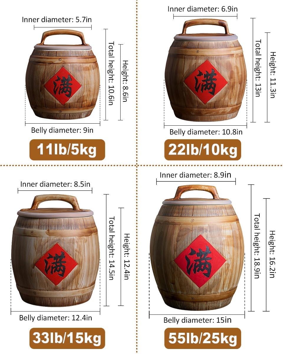 - Exquisite appearance- Good seal to keep the rice fresh- 11lb, 22lb, 33lb, or 55lb Large-capacity design meets the daily needs of the family, saving space; - Excellent gift choiceCeramic rice bucket with handle Material: Ceramic, High temperature firingColor: Brown, with Nature Inspired Engraving4 Sizes of Capacity: 11lb/5kg —— Inner diameter, 5.7"/14.5cm — Belly diameter, 9"/23cm — Height, 8.6"/22cm — Total height, 10.6"/27cm22lb/10kg —— Inner diameter, 6.9"/17.6cm — Belly diameter, 10.8"/27.5cm — Height, 11.3"/28.7cm — Total height, 13"/33cm33lb/15kg —— Inner diameter, 8.5"/21.7cm — Belly diameter, 12.4"/31.5cm — Height, 12.4"/31.5cm — Total height, 14.5"/37cm55lb/25kg —— Inner diameter, 8.9"/22.7cm — Belly diameter, 15"/38cm — Height, 16.2"/41.2cm — Total height, 18.9"/48cmApplicable scenarios: kitchen, living room, food store, cafe, bar, restaurant, schoolMultipurpose: Can be used as a tea jar, pickle bucket, nut box, candy box, dry goods jar, seasoning dispenser, rice bucket, cereal container, snack bottle jar, milk powder jarStorage method: Store in a cool and dry placePackage includes:1x Ceramic rice Jar with Airtight Lid and Silicone Tip: 1. Please understand that the color of the product may vary slightly due to lighting, shooting and monitor.2. We only sell grain containers, the others are props.