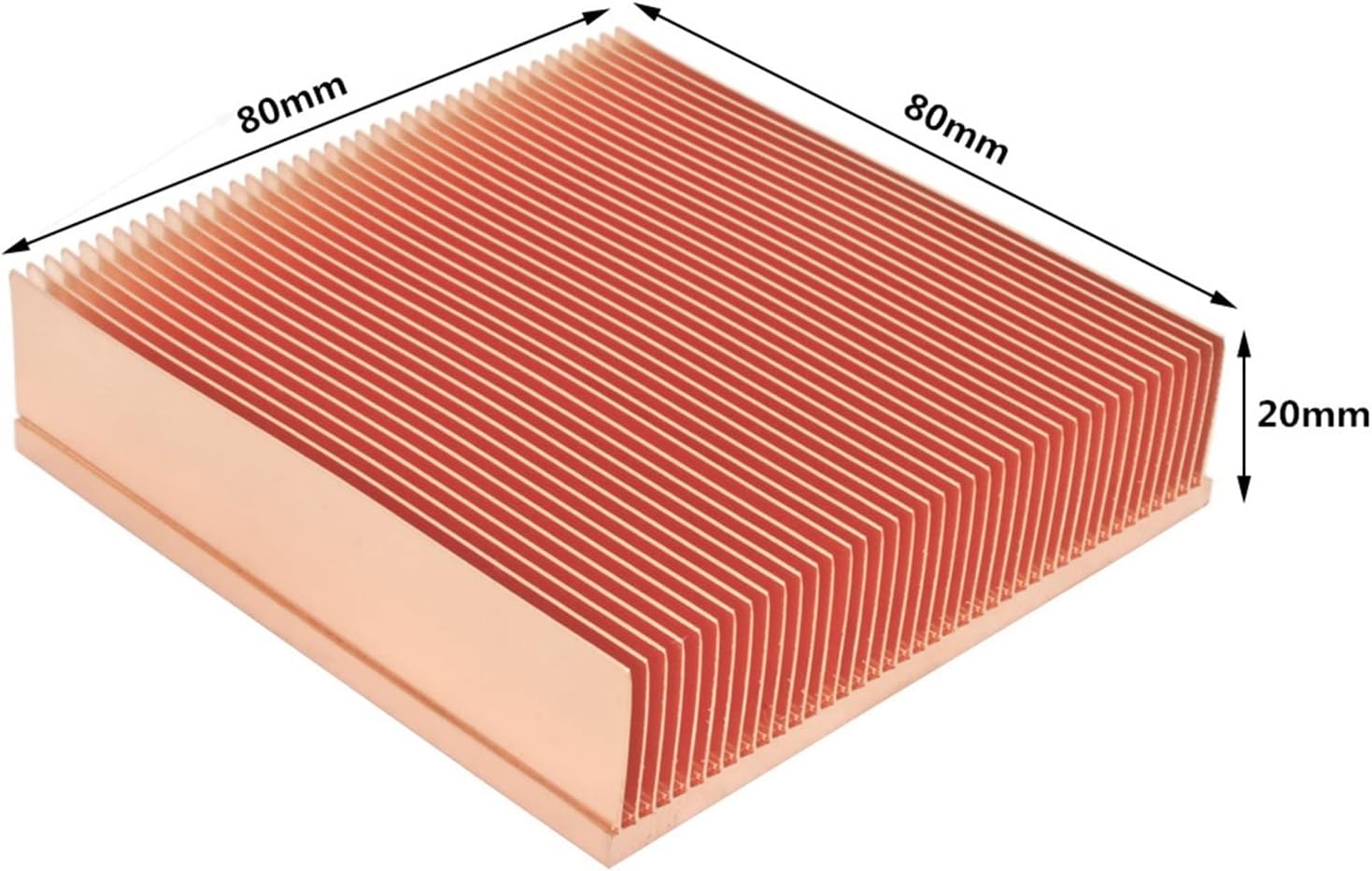 Product DescriptionExteral Size: 80X80x20mm Material: Pure CopperProcessing method:Skiving finFinishing: Antioxidant treatmentBottom Thickness: 3.5mmCopper Fin thickness: 0.5mmWeight: 420g +/- 30gPackage:1pc1.Used for Electronic ,LED,CHIP computer 's component heat dissipation, or anywhere you need a efficient heatsink.2.This Heatsink is made of pure copper, and the thermal conductivity up to 401W/(mK.)3.This is high quality and effective heatsink that made pricise processing,smooth surface,no burr,we recommand you choose this.4.Item color displayed in photos may be showing slightly different on your computer monitor since monitors are not calibrated same.Welcome to Lingfeng Storehappy shopping, happy shopping