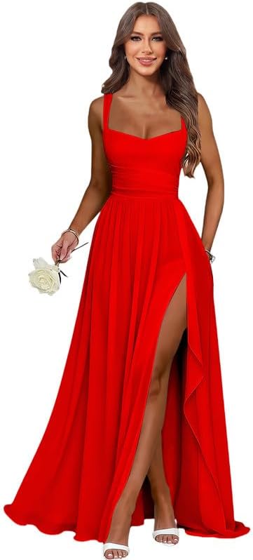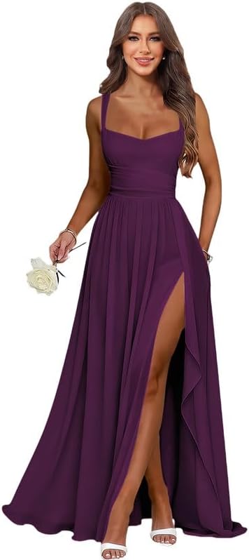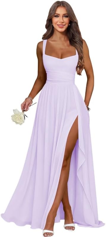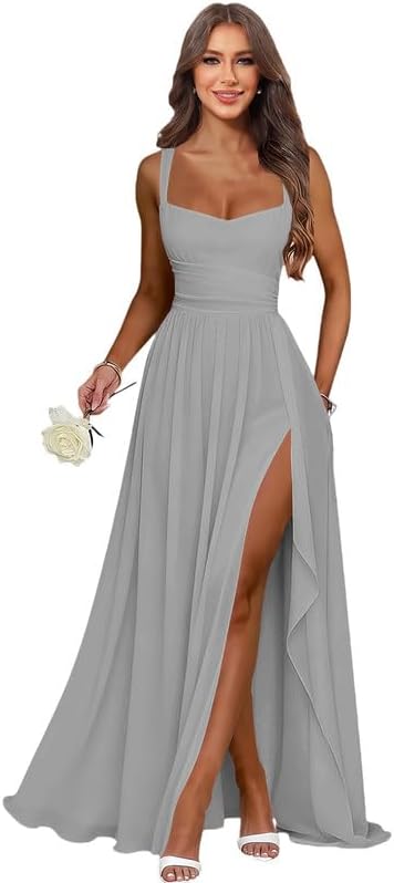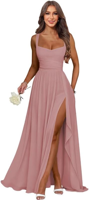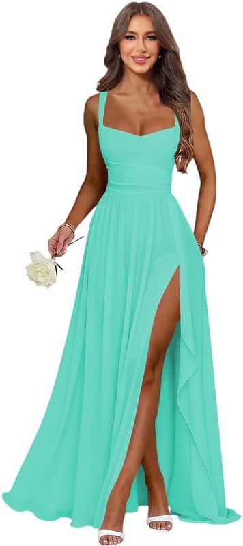 chiffon bridesmaid dresses for women spaghetti straps long square neck formal dress with slit a line evening dresses floor length party dress wedding guest dress maxi dress formal evening gown