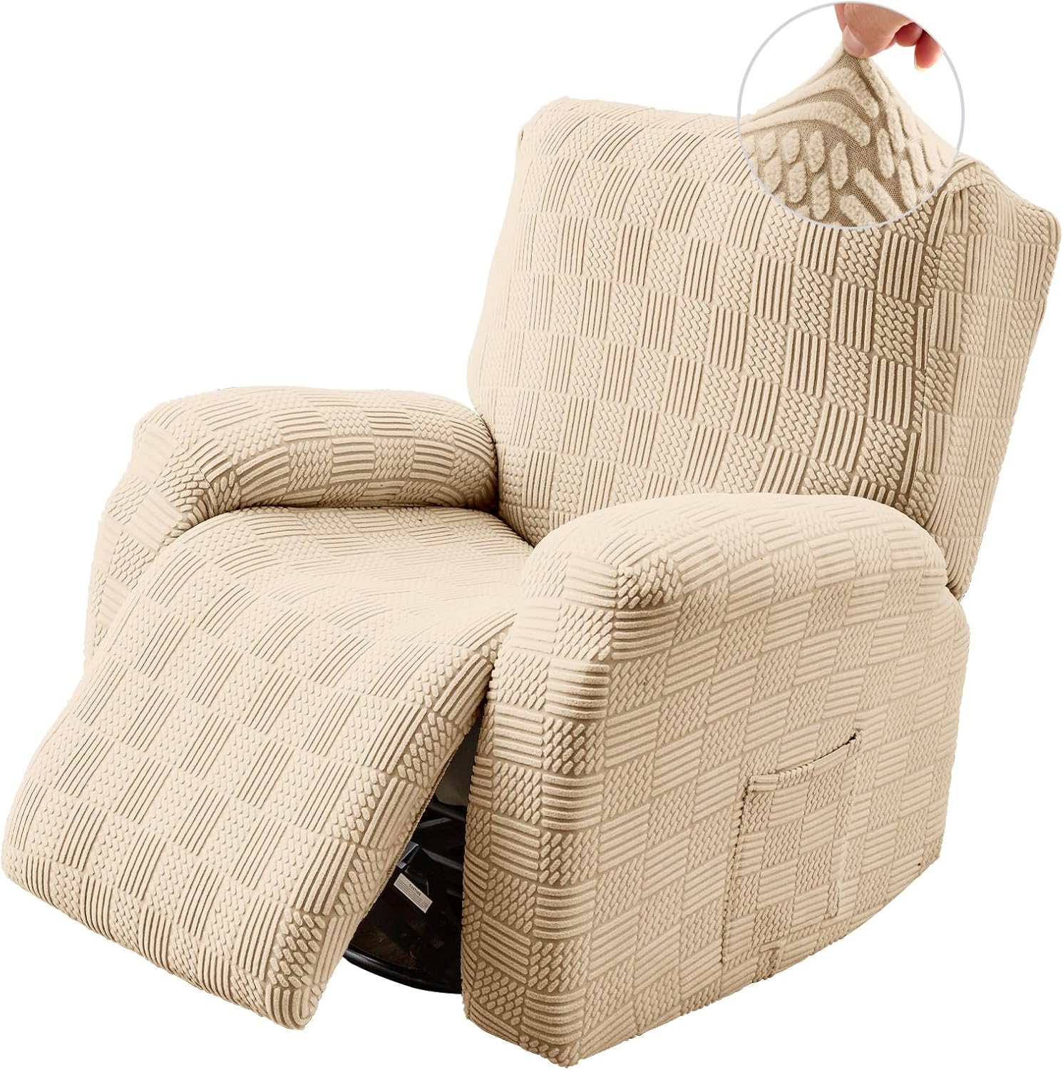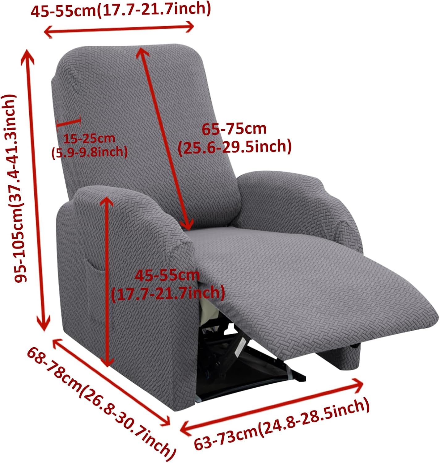 Recliner Chair Cover for Small Spaces , 2024 New Stretch 1Seat Recliner Couch Cover with Pockets, Elastic Armchair Cover Couch Protector for Dogs Pets Kids With our recliner covers for recliner chair to give your recliner a new look. It could fit your furniture perfectly and cover your recliner chair on every edge with built-in elastic corners. Recliner chair covers make with newest jacquard knitting pattern. The fabric is soft, breathable and highly elastic, durable for long time use. Recliner chair cover is effortless to install on and off with instruction tags which will seamlessly guide you through the installation process. Our recliner slipcover features side pocket to serve as storage compartments.Designed with the modern user in mind, the recliner cover is a must-have for home theaters and hotels Specification: Style: Modern Pattern: Jacquard Material: 92% Polyester and 8% Spandex Pack Size:26*19*9 CM/10.2*7.4*3.5 IN Back Area: 37.2-41.2 IN (L) x 17.5-21.5 IN (W) Seat Area : 26.7-30.7 IN (L) x 24.5-28.5 IN (W) Arm Areas :26.7-30.7 IN Weight:0.8KG/1.7 LB Easy Care: Machine Washable, Do Not Iron, Do Not Bleach, Hang Dry. Package: 1 x Small Recliner Chair Cover