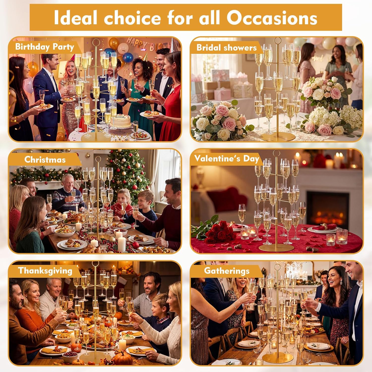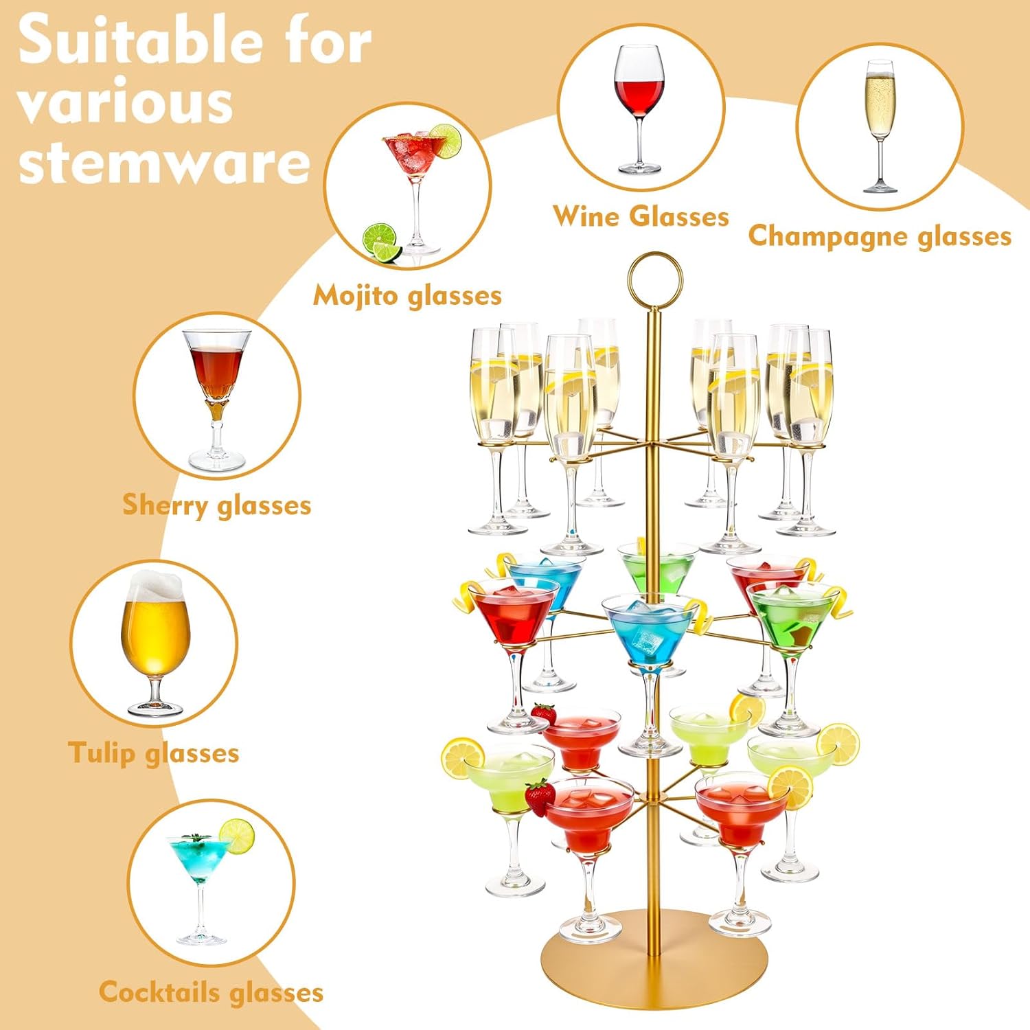 Features: Thoughtful gift: This gold martini tower stand is a standout gift for newlyweds, cocktail lovers, or anyone who loves hosting. Its elegant design with functional use makes it a memorable present for any occasion Elevate event vibe: This champagne holder for parties features a gold finish, adding a stylish and modern touch to parties, weddings, or restaurant displays. It blends seamlessly with festive, elegant, or casual decoration styles, enhancing the party atmosphere. Specifications: Material: iron Color: gold Size: the holder is 33.5 inches/ 85 cm high, base diameter of 11.02 inches/ 28 cm, the shelf support has a radius of 6.7 inches / 17 cm, and a diameter of 14.5 inches/ 36.83 cm, individual column height of 8.3 inches/ 21 cm, a cup holder width of 1.9 inches/ 4.8 cm Package includes: 1 pcs x cocktail tree stand for drinks Notes: Manual measurement, please allow slight errors on size. The color may exist a slight difference due to different screen displays Small parts included, please keep them away from little kids to avoid swallowing risk