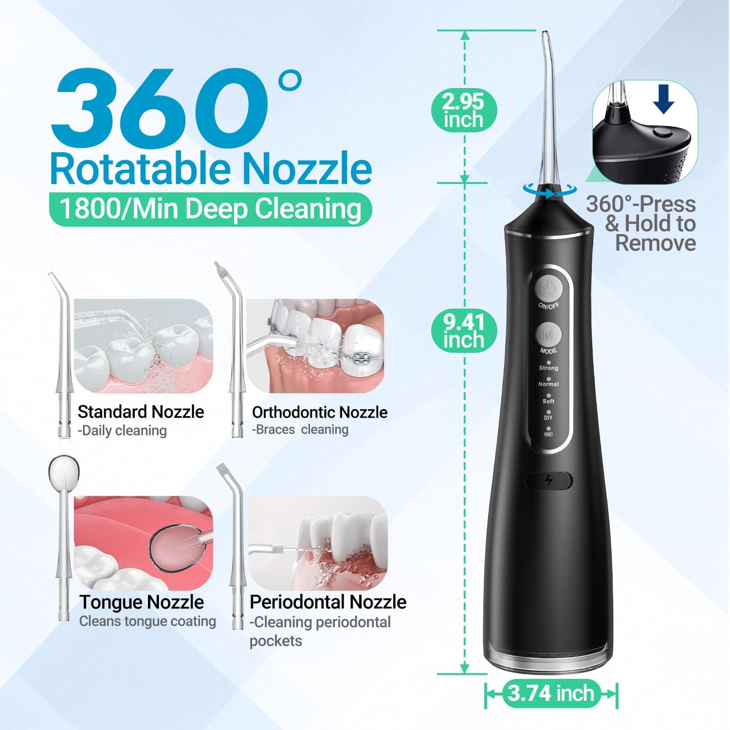 Transform your oral hygiene routine with this advanced cordless water flosser. Featuring 4 specialized cleaning modes and 4 interchangeable jet tips, this dental irrigator delivers powerful yet gentle water pulses to clean deep between teeth and along the gumline. The generous 300ml water tank provides ample capacity for thorough cleaning sessions, while the IPX7 waterproof rating ensures safe operation. The 360° rotating nozzle reaches all angles of your mouth with ease, making daily flossing more effective and convenient. Perfect for home use or travel, this rechargeable oral irrigator helps maintain optimal dental health wherever you go. The compact, portable design fits easily in your bathroom or travel bag, while the cordless operation gives you complete freedom of movement. Keep your smile bright and healthy with this professional-grade water flosser that brings the power of dental office cleaning to your daily routine.