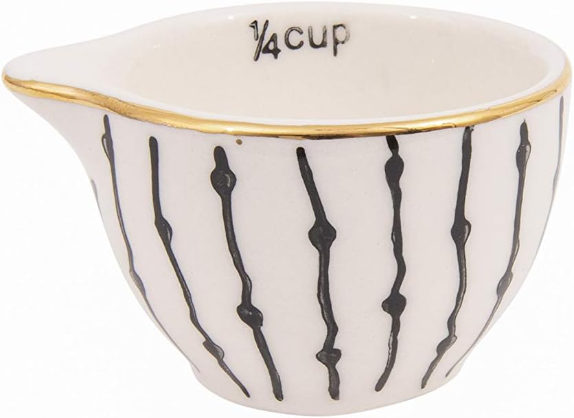 This set of 4 stoneware measuring cups with batter bowl shapes is the perfect gift for the chef or foodie in your life. These are designed for easy use with a pour spout and clear size markings. The gold electroplating and black pattern adds chic touch to make baking fun!