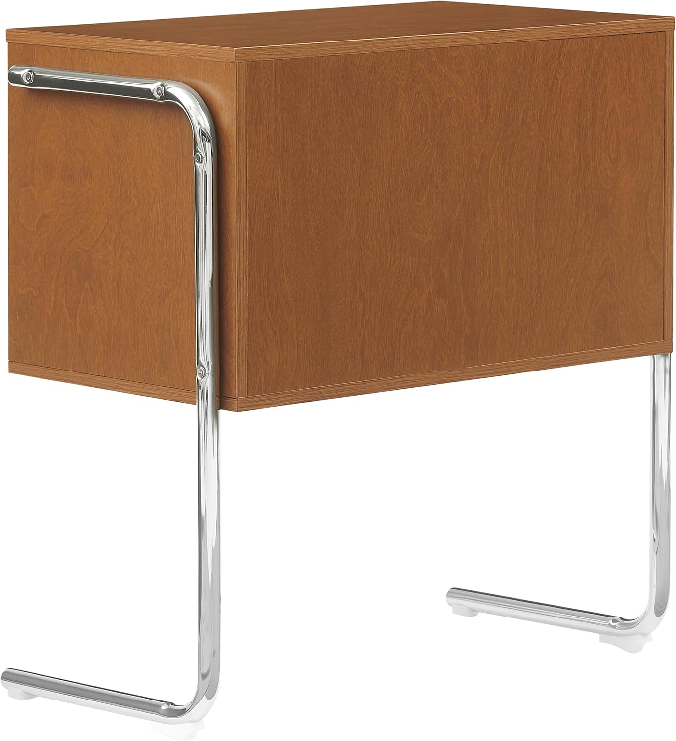 Add a touch of retro charm to your space with the Lily Record Player Stand With Vinyl Storage. It features a warm wood finish and chrome C-shaped legs. The top is perfectly sized for all-in-one record players, while the vertical storage section holds up to 90 records in an upright position. Spin vinyl in your living room or curate a listening corner in your office with this stylish turntable stand.