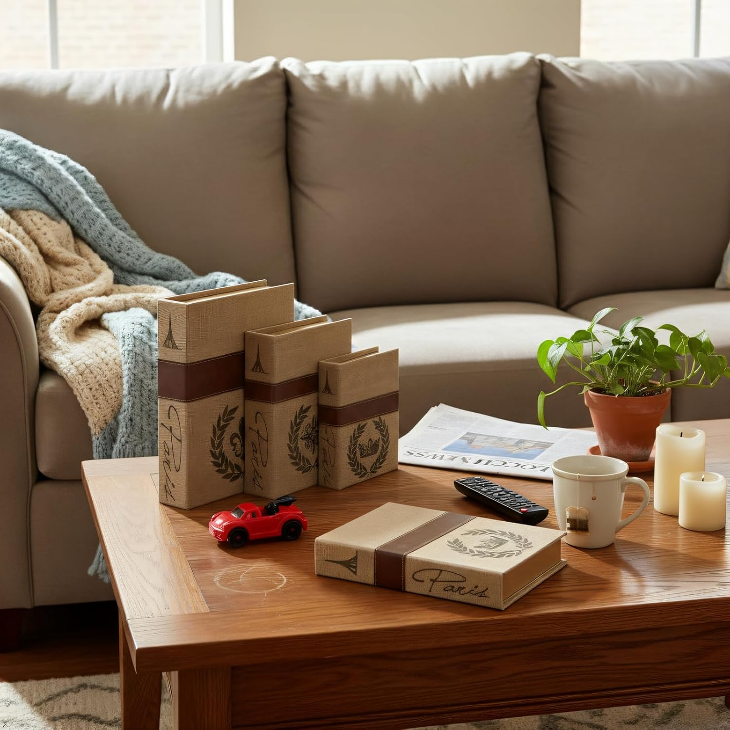 Add a touch of Parisian elegance to your home decor with this charming set of three boho decorative faux book boxes. Featuring a sophisticated French-inspired design with Eiffel Tower motifs, fleur-de-lis emblems, and laurel wreath patterns, these storage boxes beautifully combine form and function. The exterior is wrapped in natural linen fabric accented with rich brown leather-look bands, creating a vintage aesthetic that complements any room. Perfect for storing keepsakes, trinkets, or organizing small items, the boxes come in graduated sizes measuring 14.8", 12", and 9.3" in height. Each box opens to reveal a practical storage space while maintaining the appearance of classic bound books when closed. The neutral color palette and timeless design elements make these boxes an ideal addition to bookshelves, side tables, or as standalone decorative pieces. The combination of rustic linen texture and ornate French details creates an air of sophistication that elevates your home's decor while providing hidden storage solutions.
