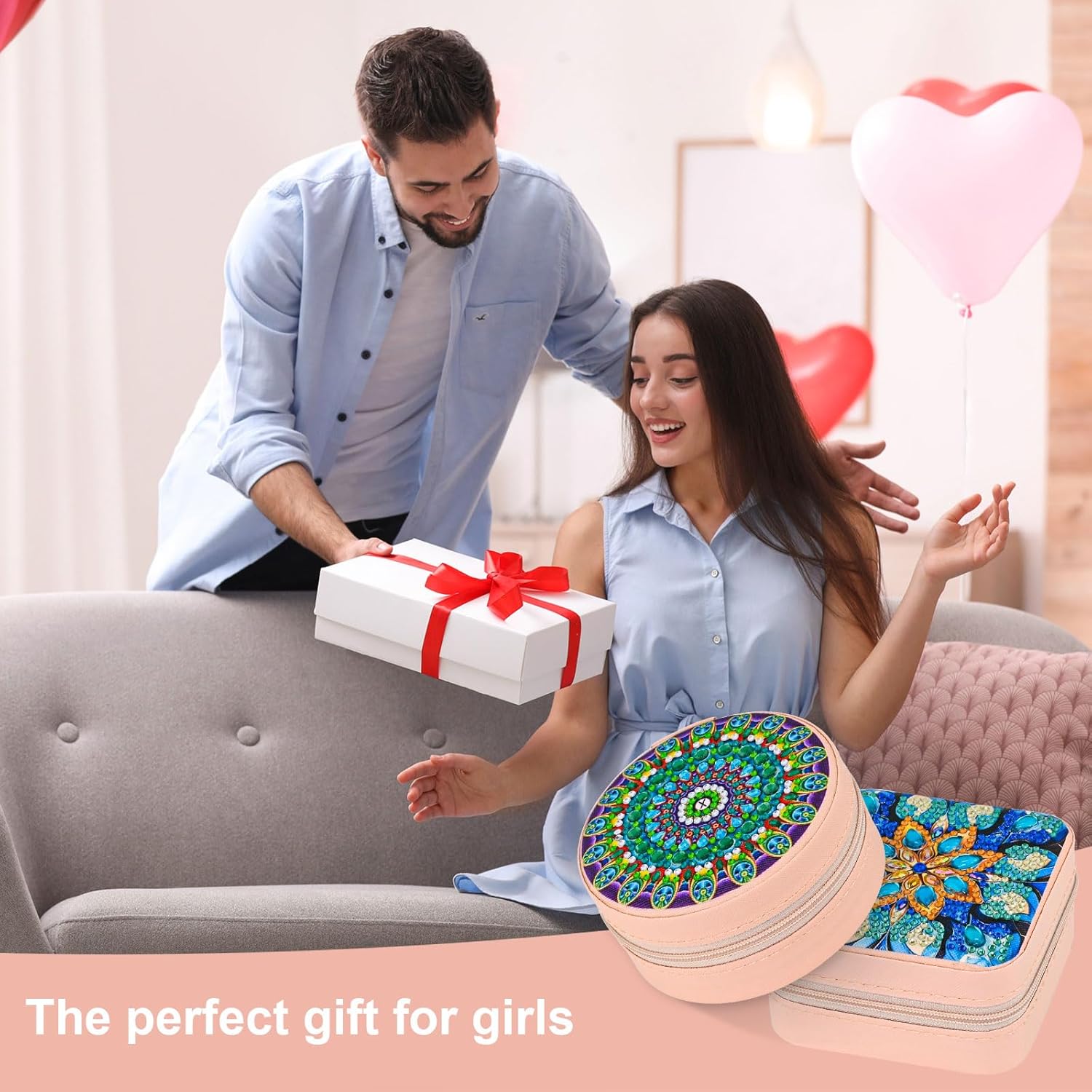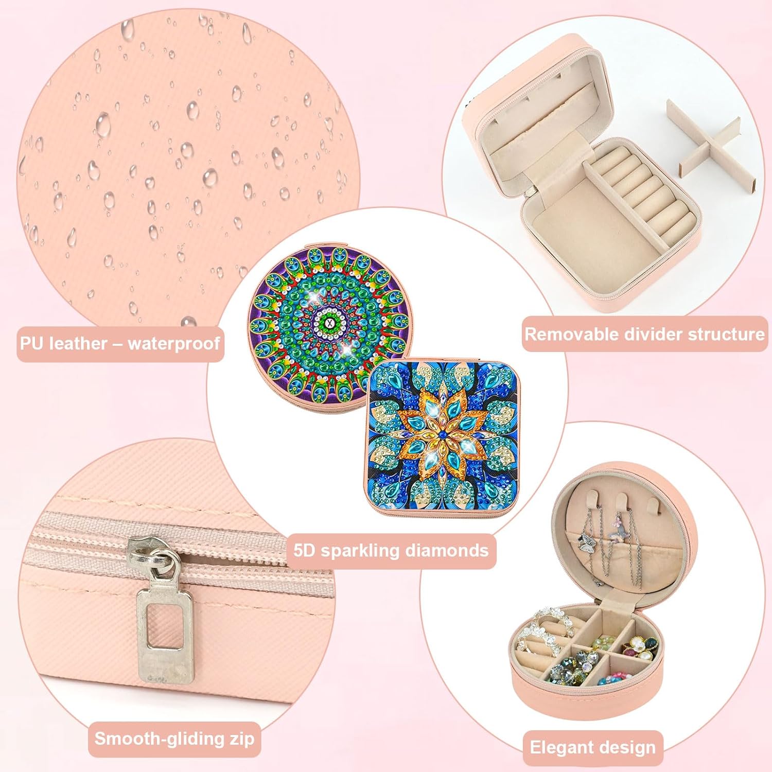 Product Name: DIY diamond painting jewellery box set. Product Features: Very beautiful looking diamond painting handmade project, you can create a unique jewellery box by yourself, the beautiful pattern and diamonds on the lid make the box more dazzling and beautiful, perfect for birthday gift for 5-14 years old girls, children's day gift, our diamond painting is easy to make, children can also make it, you can do it with your family and carry out parent-child activities to strengthen the family ties, the finished product is also very suitable for Mother's Day as Gift to mum! The finished product can be used as a table decoration, perfect for storing your jewellery, such as earrings, rings, necklaces, no longer have to worry about jewellery damage or loss. Specifications: Colour: pink. Material: faux leather. Shape: square + round. Size: square (9.6 x 9.6 x 5 cm) round (10 x 10 x 5 cm). Steps for use: 1. Remove the protective film. 2. Place the diamond in the painting tray. 3. Apply glue with a pen and place the diamonds on the figures. 4. When you are finished, enjoy your unique storage box. Note: The size is measured manually, there may be 1-2 cm error