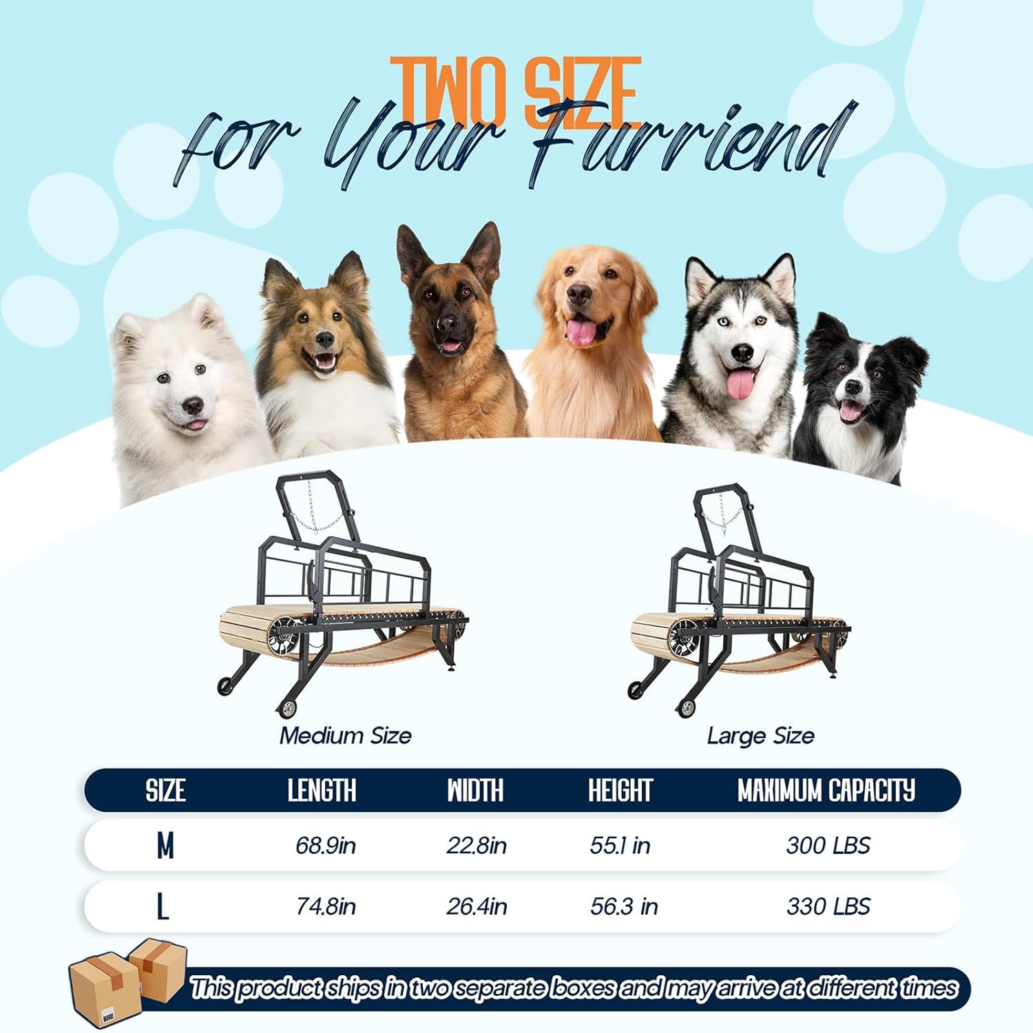 • ADJUSTABLE LEASH: Our dog treadmill features an adjustable leash to easily accommodate dogs of different sizes, ensuring your pet's safety on the track. The treadmill can support a weight of 300 lbs (M) / 330 lbs (L)
