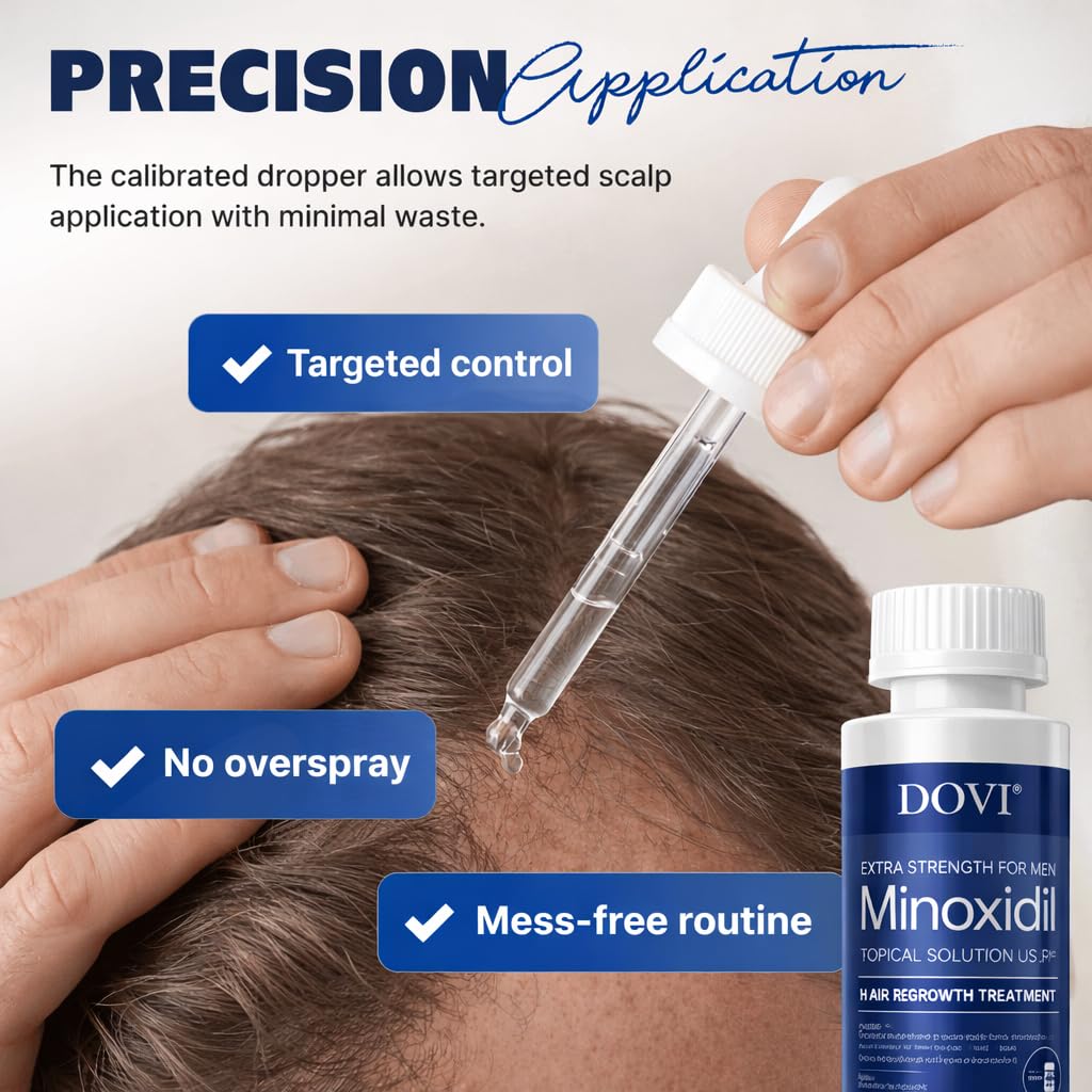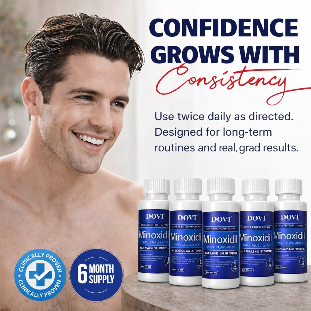 Take control of hair thinning with Dovi Minoxidil 5% for Men, a clinically proven solution designed to help regrow hair and slow further hair loss. Formulated with the highest over-the-counter strength of Minoxidil, this extra strength topical treatment works directly at the scalp to reactivate hair follicles, extend the growth phase, and support thicker, fuller-looking hair over time. Hair loss can progress gradually, but consistent treatment can make a meaningful difference. Dovi is designed to help men address thinning at the crown and top of the scalp with a simple, effective daily routine that fits seamlessly into everyday life. Clinically Proven Regrowth Technology Minoxidil 5% is the #1 dermatologist-recommended active ingredient for hair regrowth. It works by increasing blood flow to the scalp and stimulating inactive hair follicles, helping promote visible regrowth with continued use. Extra Strength 5% Formula Engineered for performance, this high-strength formula penetrates the scalp to support stronger, healthier hair growth. Ideal for men experiencing early to moderate hair thinning who want a proven, non-prescription solution. Complete 6-Month Supply for Consistency Includes six bottles (12 fl oz total), providing a full 6-month supply to support uninterrupted use. Consistency is key — many users begin to notice improvements within 3–4 months, with more significant results after continued use. Precision Dropper for Targeted Application Each bottle includes a precision dropper designed to deliver the solution directly to affected areas. The lightweight, fast-absorbing formula spreads easily and integrates into both morning and evening routines without disrupting your day. Supports Thicker, Fuller-Looking Hair With regular use, Dovi Minoxidil helps improve the appearance of hair density and coverage. Whether you are just beginning to notice thinning or looking to maintain existing hair, Dovi provides a reliable solution backed by clinical evidence.