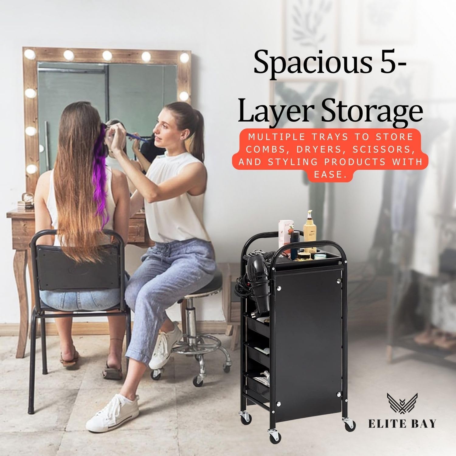 Effortlessly blend style and functionality with our 5-Layer Metal Hairdressing Trolley. Constructed from durable metal and styled in a modern black and gold finish, this salon trolley is designed for professionals who demand convenience and sophistication. Its spacious five-tier layout provides ample storage for all your essential tools—hairdryers, brushes, sprays, and more—while the smooth-rolling wheels offer easy maneuverability across your workspace. Whether you run a salon, spa, or barber shop, this trolley keeps your tools at your fingertips and your workspace clutter-free.