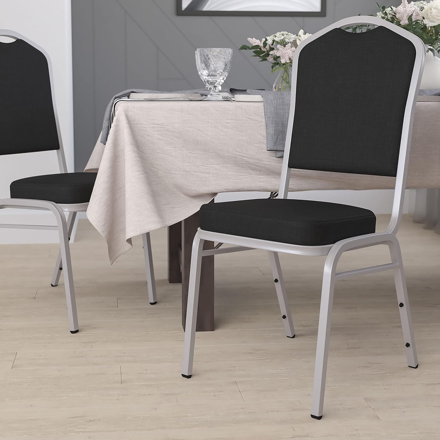 Make an impressive presentation in your banquet hall when clients come to visit your facility with these ballroom chairs. Built for the commercial industry these popular crown back banquet chairs have been tested to hold up to 500 pounds. With a high seating capacity these stack chairs are perfect for the event rental business. This standout hospitality chair can be used as is and still command attention or be dressed up for formal events by placing a chair cover over it. The chair is cushioned with 2.5" thick CAL 117 fire retardant foam and is covered in durable upholstery for high usage. The sturdy frame with gracefully angled legs are made of 16 gauge steel in a lasting powder coated finish. Double support braces reinforce the frame to give it great strength and durability. Bumper guards prevent scratches on the frame when stacked (up to 15 high) and non-marring floor glides protect your floor by sliding smoothly when you need to move the chair. This multi-use stacking upholstered stack chair is an excellent option for churches, banquet halls, training rooms, hotels, convention centers and schools. Add banquet chairs to your home dining table to add a contrasting look to your dining room or kitchen.