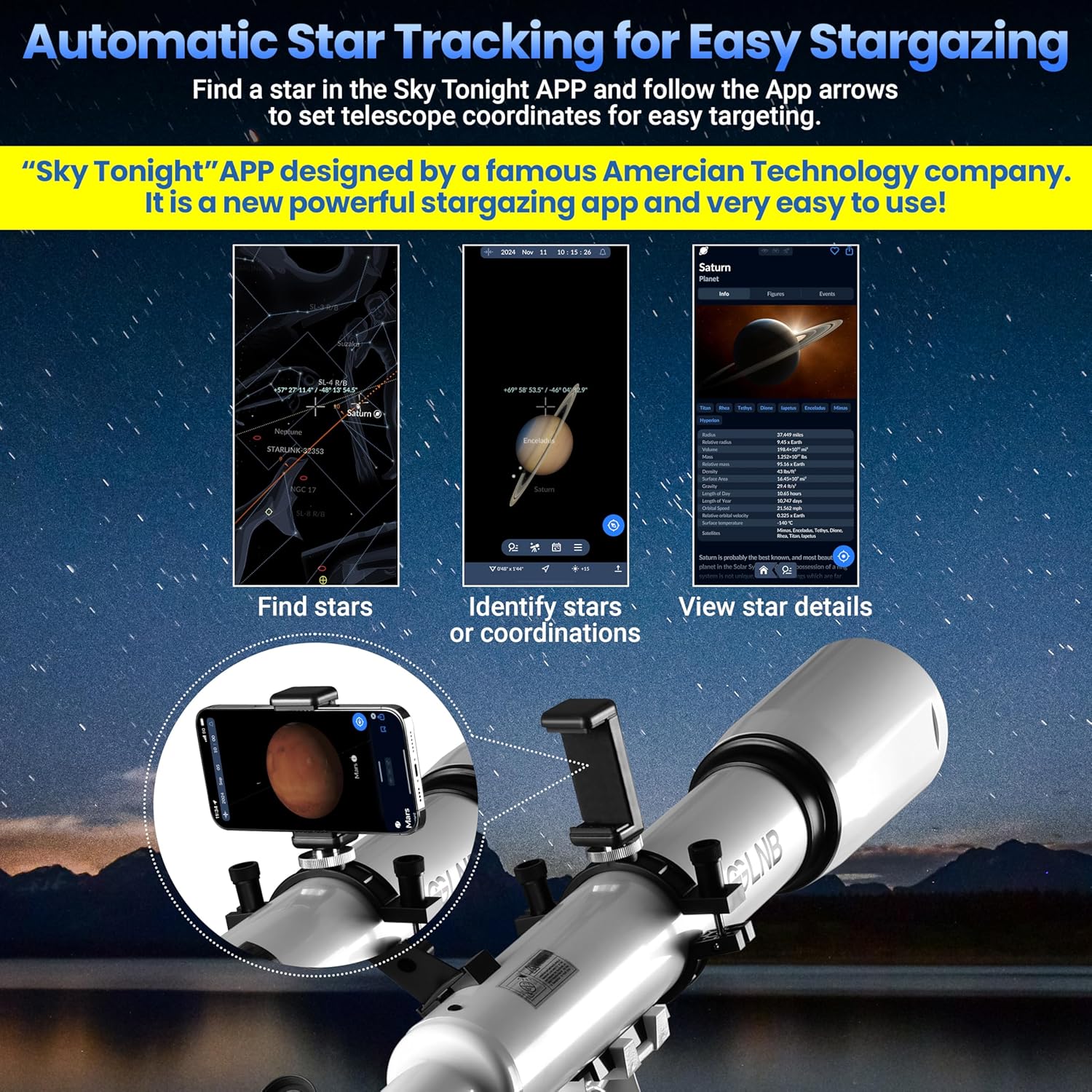 | Additional Features | Stargazing App with Automatic Celestial Tracking |