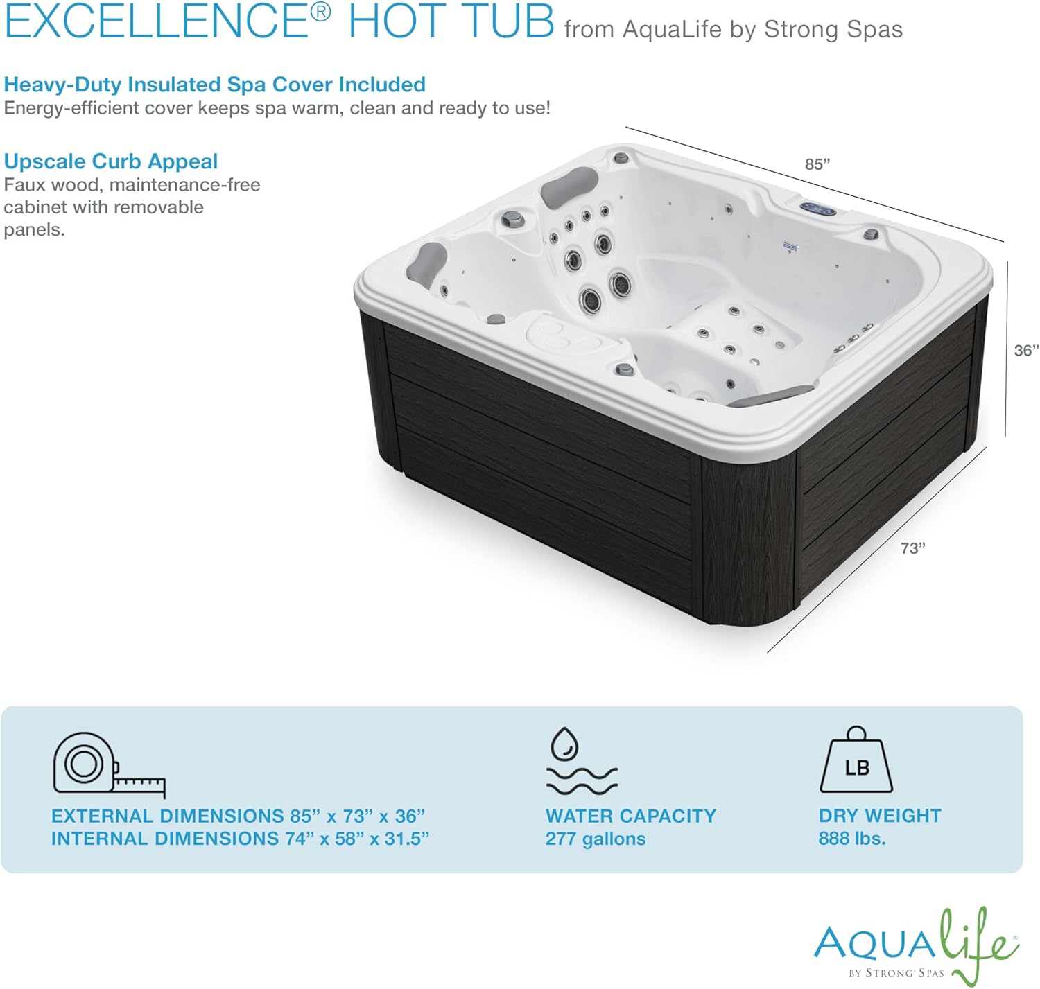 Excellence Outdoor Hot Tub, FIts 4 Adults, Indoor Outdoor Hot Tub, 41 Jets, Cover Included, Lounger Spa, Bluetooth Stereo, LED Water Fall, Wellness Tool, Aqualife by Strong Spas