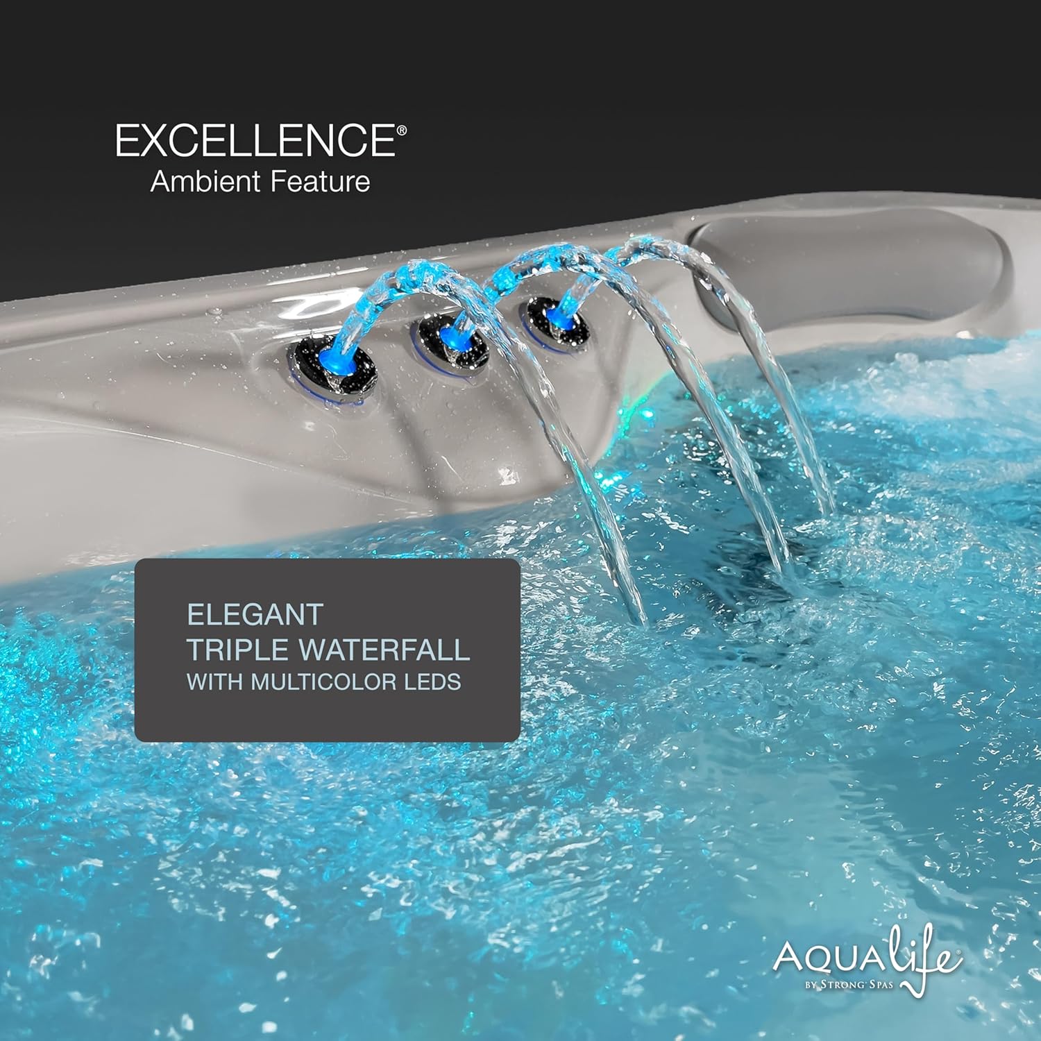 Excellence 41-jet 188 port lounger spa from Aqualife by Strong Spas Seats up to 4 people at once with integrated headrests and a full-body lounger seat. Host a small gathering or enjoy by yourself for luxurious relaxation at the end of long day. 41 stainless steel jets (comprised of 33 adjustable hydro jets, and 8 stainless steel air jets) are driven by 3 total Pumps, including 1 x 3 CHP high-speed Pump, a blower Pump and circ Pump. Excellence soothes away soreness and tension, bringing tranquility to mind and body. Built-in programmable multicolor LEDs add ambiance and enhance the atmosphere while taking a soak. With Bluetooth integrated sound system connectivity, the Excellence spa lets you stream music and audiobooks from your smartphone while you relax. Set the temperature, jets, waterfall and built-in lights, then pair your phone via Bluetooth and sink into the spa for warmth, comfort, and relaxation. Heavy-duty insulated spa cover is included.