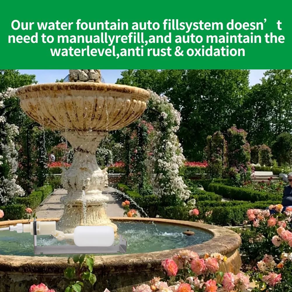 Float Valve for Tank Pool Pond Water Fountain Auto Fill System Package:Included:a float valvea stainless steel base11.48ft 1/4” tubing2 pieces connectors4 piece Suction Cups, 6 set Screws1 piece 6” length float extension armWide Use:The auto float vale fill system is suitable for bird baths tiered fountains, sidewall fountains, ponds, small pool, yard garden fountain and aquarium and fish tank, large water trough. It is also suitable for chickens, livestock water trough, aquariums, small water tanks, toilet storage tanks, etc.About Installation:use suction cups on the wall of the fountain, or use the screws to attach mounting bracket to the concrete block