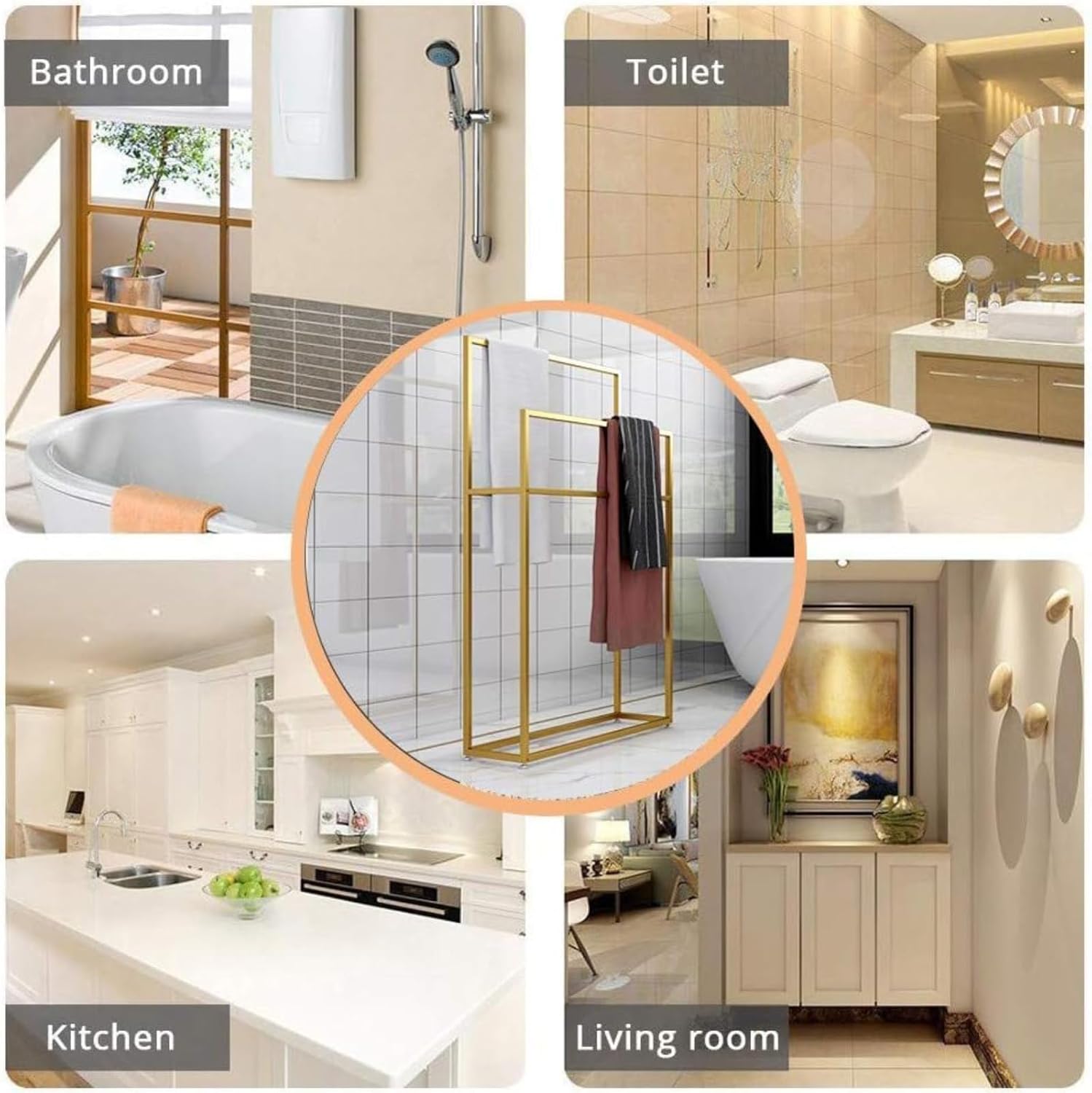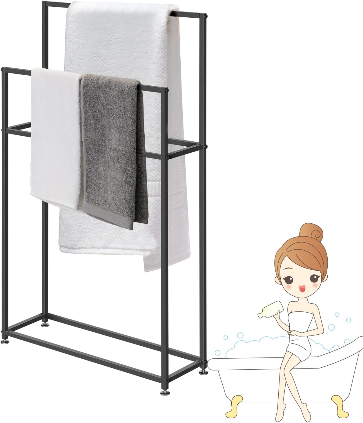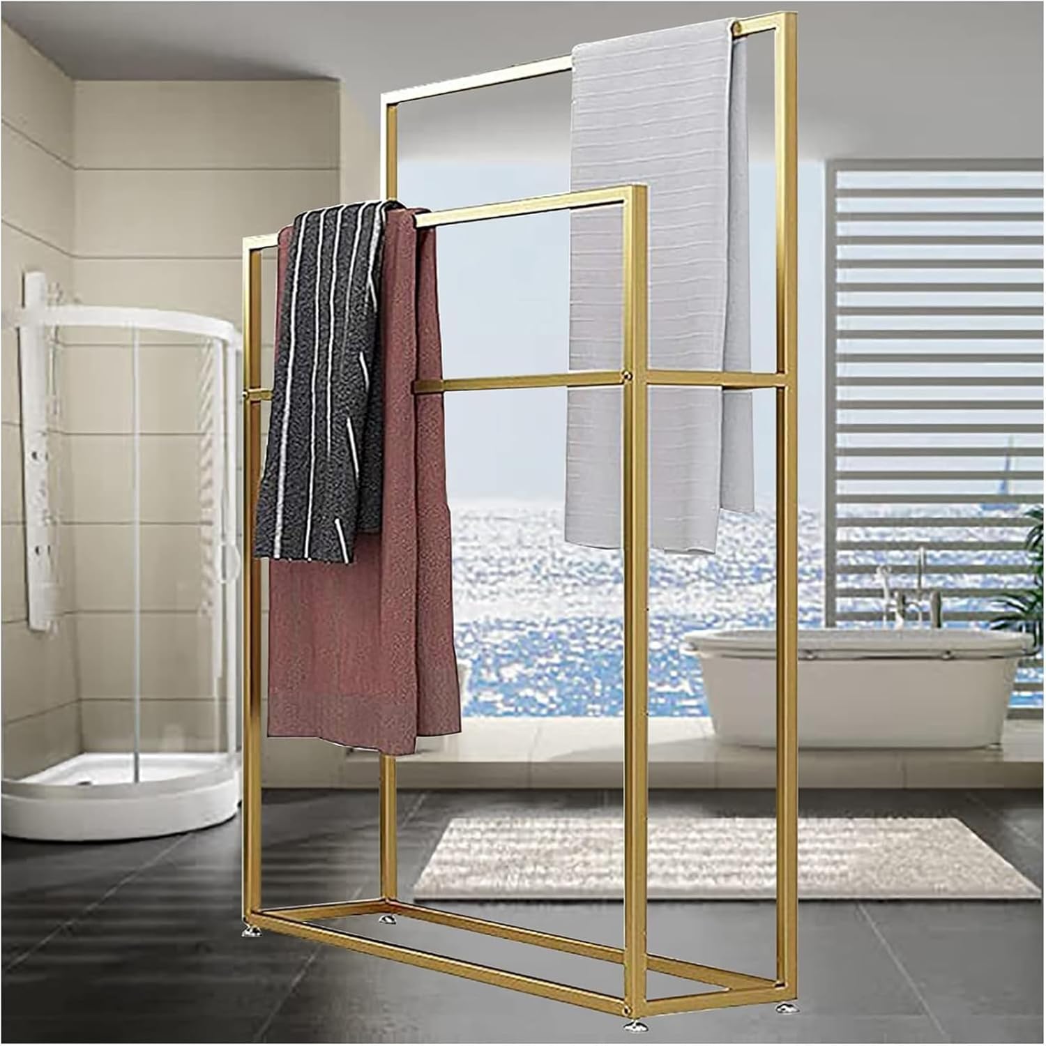 43 inch Tall Free Standing Towel Rack for Bathroom, 2 Tier Metal Towel Stand for Oversized Towels, Next to Tub or Shower, Outdoor Pool Towel RacksHolding large bath towels, bathrobes, hand towels and other washclothes in your bathroom.Also can work as the drying rack on your balcony.More taller, bigger and broader than others. Hanging bath towels without touching with each other or touching the floor.4 anti-slip feet won’t scratch the floor or tiles. You can adjust the height of the feet to balance this towel rack on uneven places.Size: 25.5x7.9x43inch / 65x20x110cm29.5x7.9x43inch / 75x20x110cm33.5x7.9x43inch / 85x20x110cmColor: Gold, BlackPackage Contents: 1 x Freestanding Towel Rack, 1 x Accessory Kit, 1 x Instruction【Worry-Free After-sales Service】If you have any questions about the product, or you don't like this product, you can return it or replace it for free.
