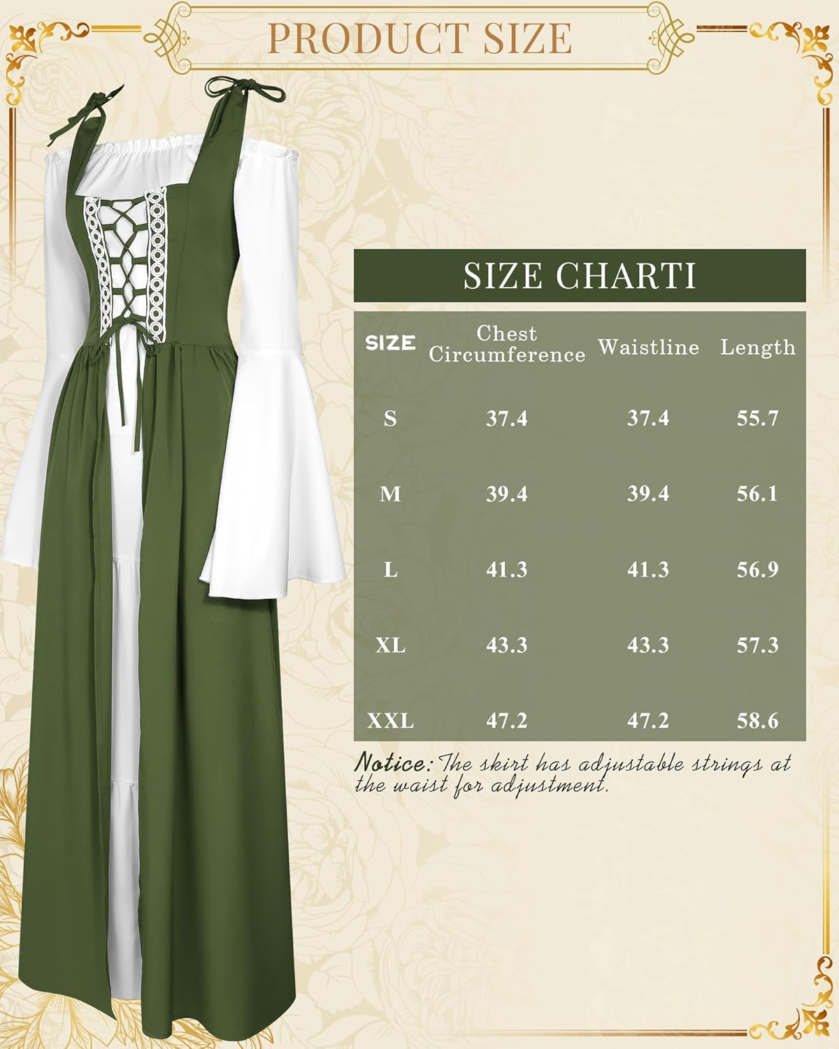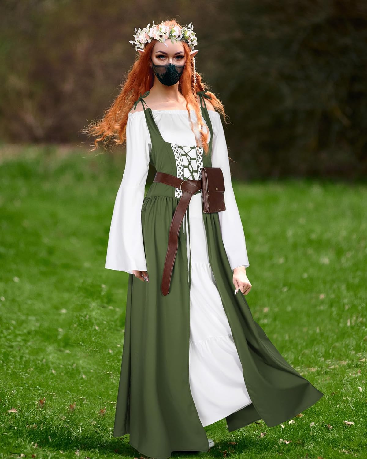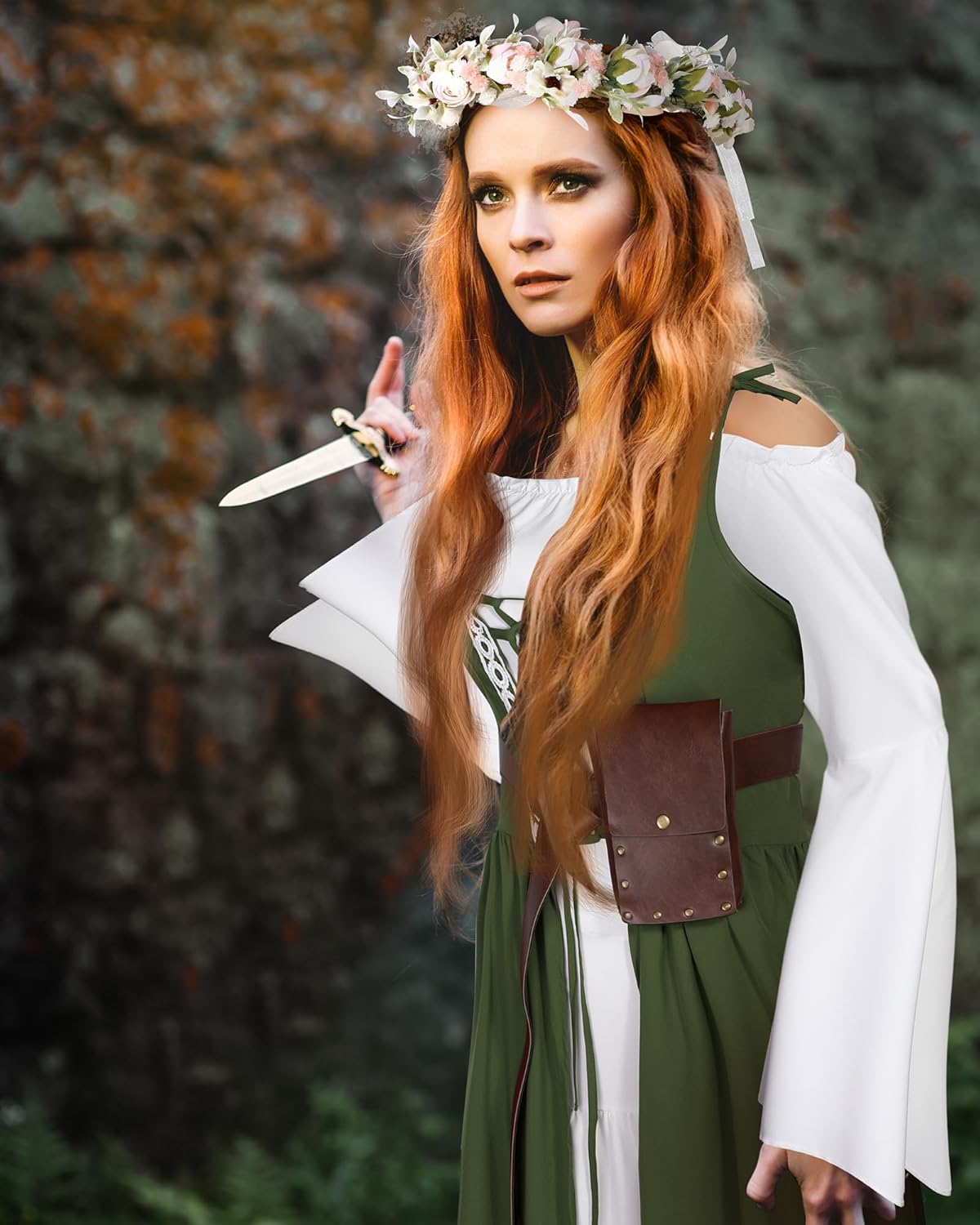 | Included Components | 1 Pair of elf ears, 1 x Belt, 1 x Floral garland, 1 x Waist bag, 1 x Women renaissance dress |