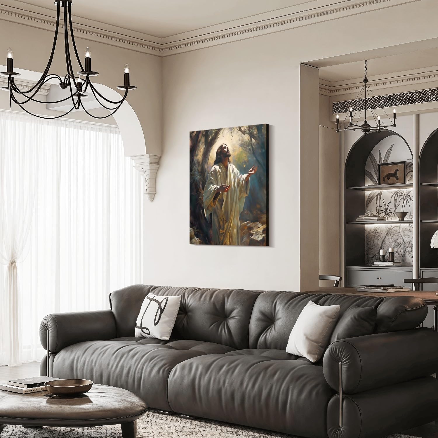 Bring peace, inspiration, and spiritual reflection into your space with this beautifully framed 16x24 inch canvas wall art featuring Jesus praying in the garden. Printed on high-quality canvas with rich, fade-resistant inks, this religious artwork captures a sacred moment with emotional depth and detail. Perfect for Christian homes, churches, and those who appreciate faith-based décor, this framed picture adds meaning to your walls. The gallery-wrapped canvas is mounted on durable wood and ready to hang, making it a convenient and timeless addition to any room.