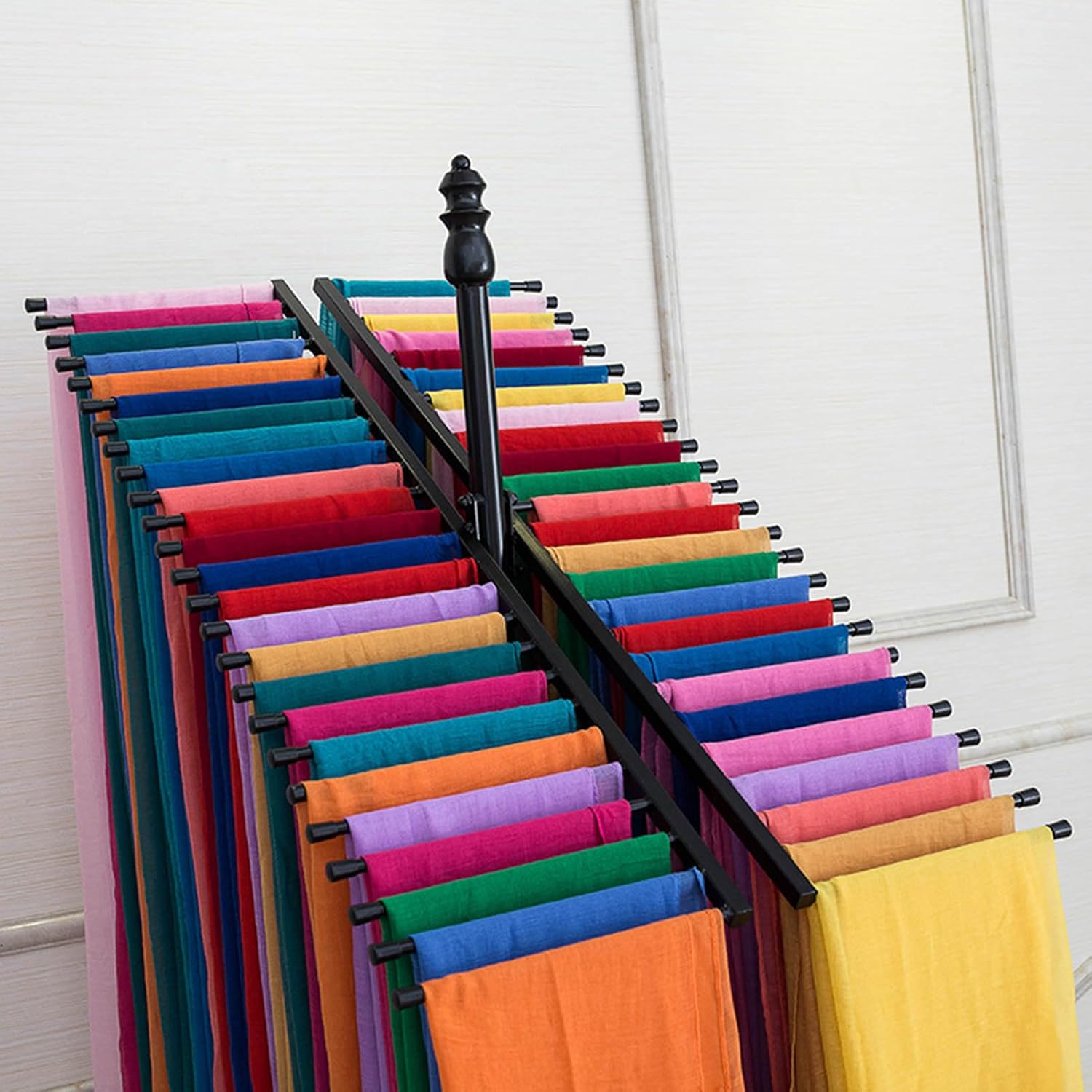 This metal scarf rack provides an elegant way to display knitted and printed scarves at home or in a retail setting. The layered rail design accommodates different scarf lengths and keeps scarves, belts, and all other accessories organized.Product name: scarf display standmaterial: metalSize: 50*170cm, 50*150cmColor: Bronze, white, blackCapacity: 40-50 piecesSuitable places: bedroom, living room, high-end stores, retail stores, hotels, office buildings, garment factories, jewelry stores, fabric display stores√Multi-purpose storage rack, can be used as scarf rack, blanket rack, fabric display rack, clothing retail rack, freestanding trouser rack, shawl display rack, belt rack√ High-temperature paint technology metal frame, exquisite appearance, delicate and bright, will not scratch your expensive scarves and scarves.√The space layout on the scarf hanger is clear, you can hang up to 40-50 scarves to make full use of the space.√ No need to drill holes in the shop or house, making them maximum applicable to your shop, they work well even in small places